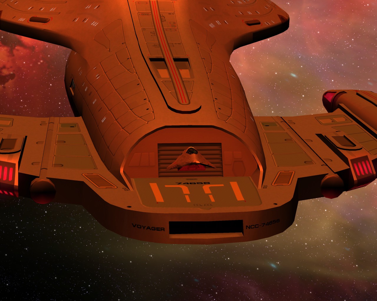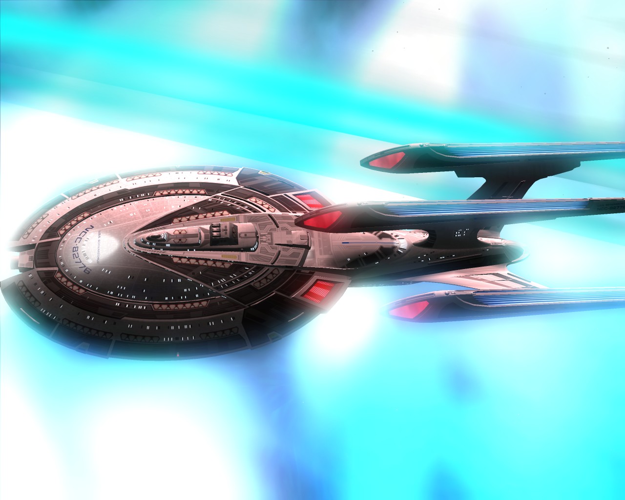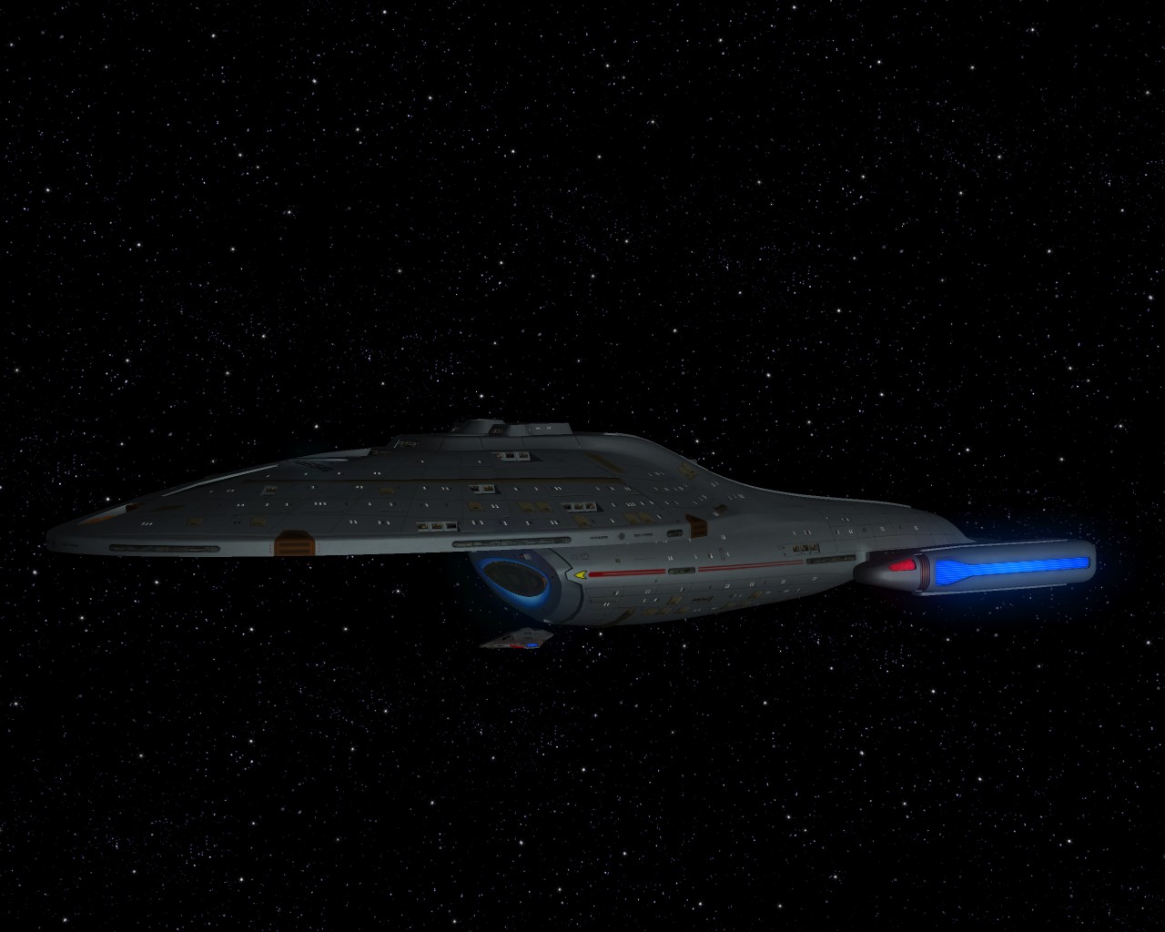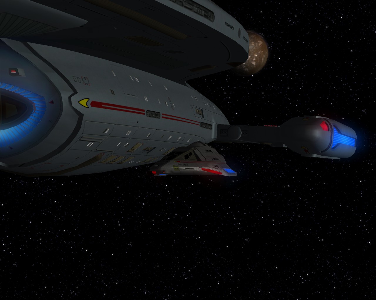 Ich hab noch Beisspielbilder aus KM 0.9 gefunden. So sollte es eigentlich normal aussehen wenn ein Schiff der Sovereign Klasse schwer beschädigt ist: