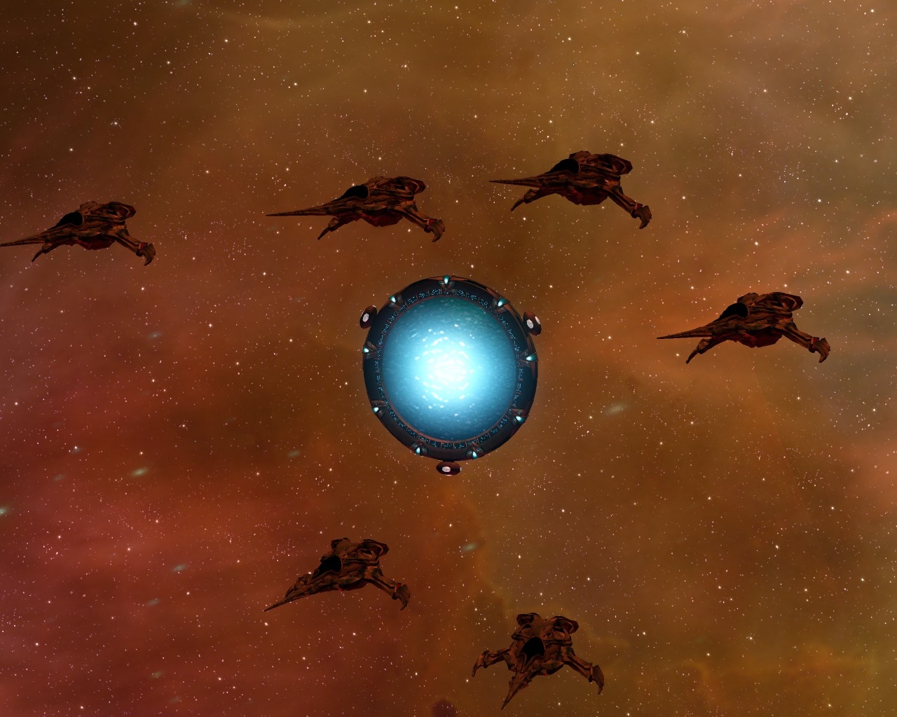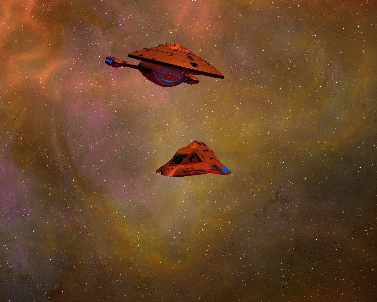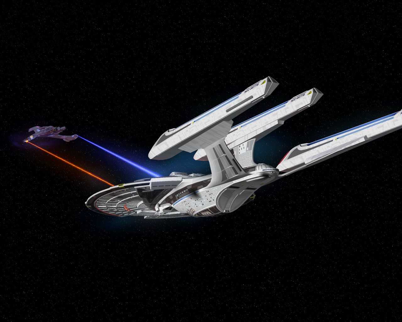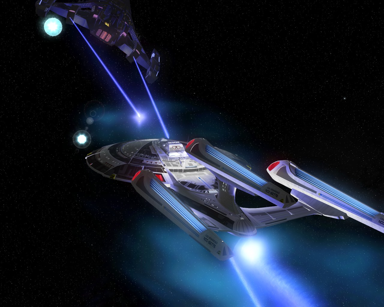 Ich hab noch Beisspielbilder aus KM 0.9 gefunden. So sollte es eigentlich normal aussehen wenn ein Schiff der Sovereign Klasse schwer beschädigt ist: