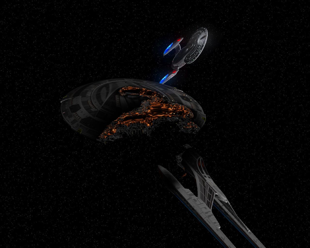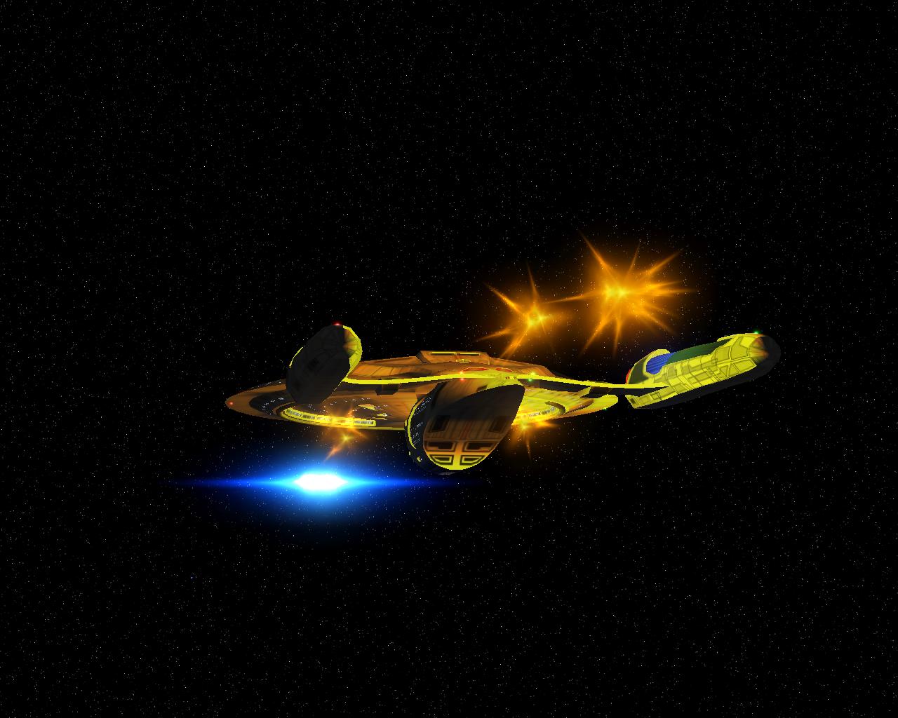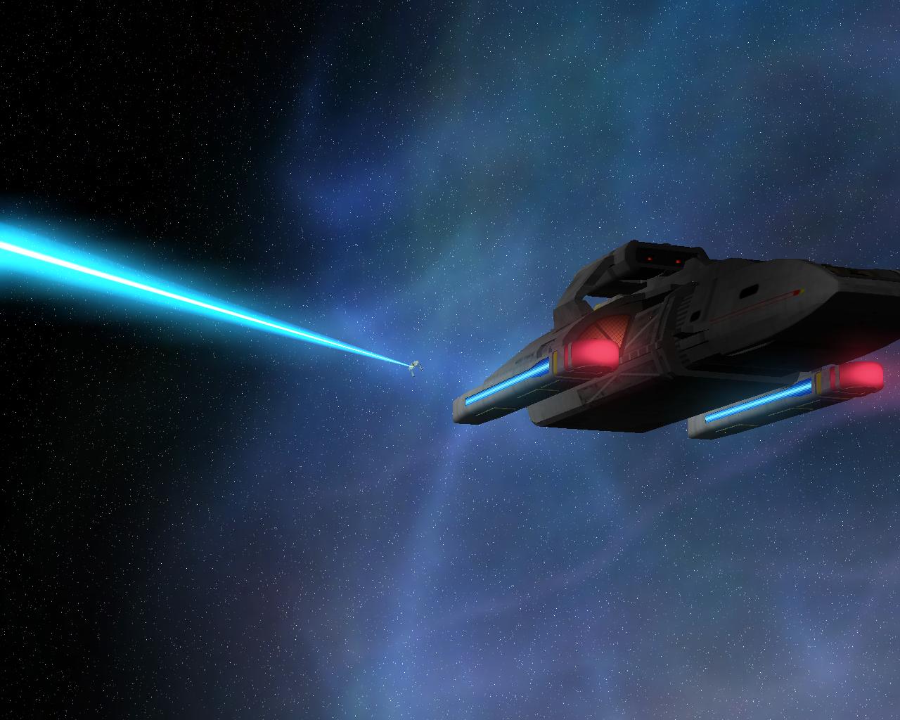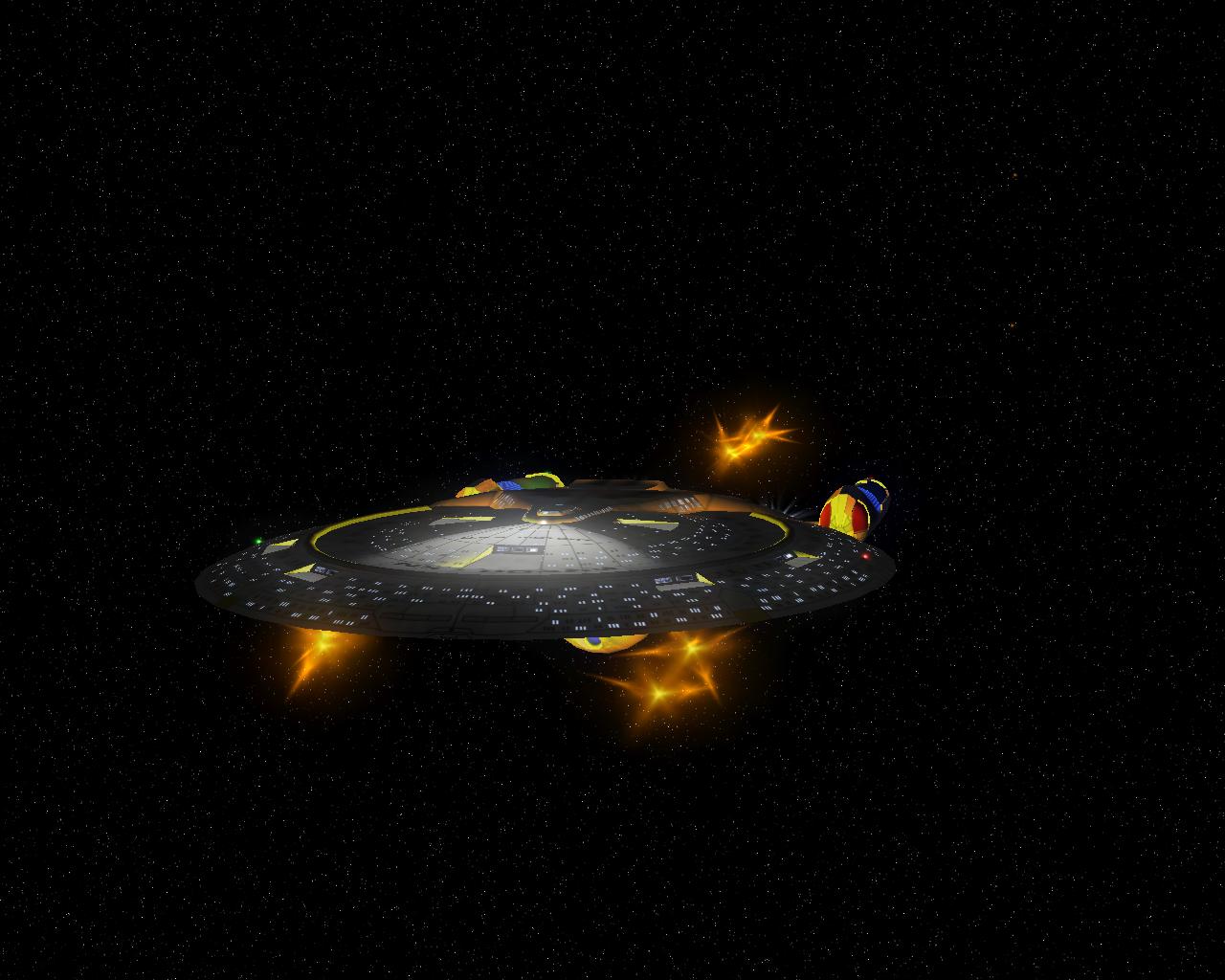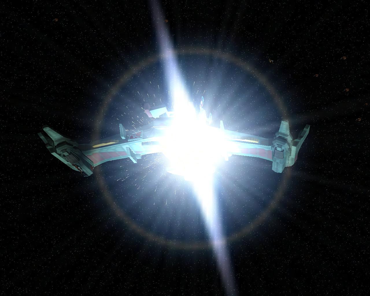 Bevor ich die Bilder mit der Prometheus gemacht hatte, testete ich ein neues Schiff "die NCC-1701-A Ghost". Sprich ein Geisterschiff, vergleichbar mit dem Segelschiff der Piraten aus Pirates of the Caribbean. Das hat auch ziemlich heftige Waffen. Ich war nämlich mit einem Schiff der Saber Klasse unterwegs und mit den ersten 2 Phaserschüssen hatte das Geisterschiff mein vorderes Schutzschild vollkommen ausgeschaltet. Die nachträglichen Photonentorpedos haben mich dann auf der Stelle zerstört.