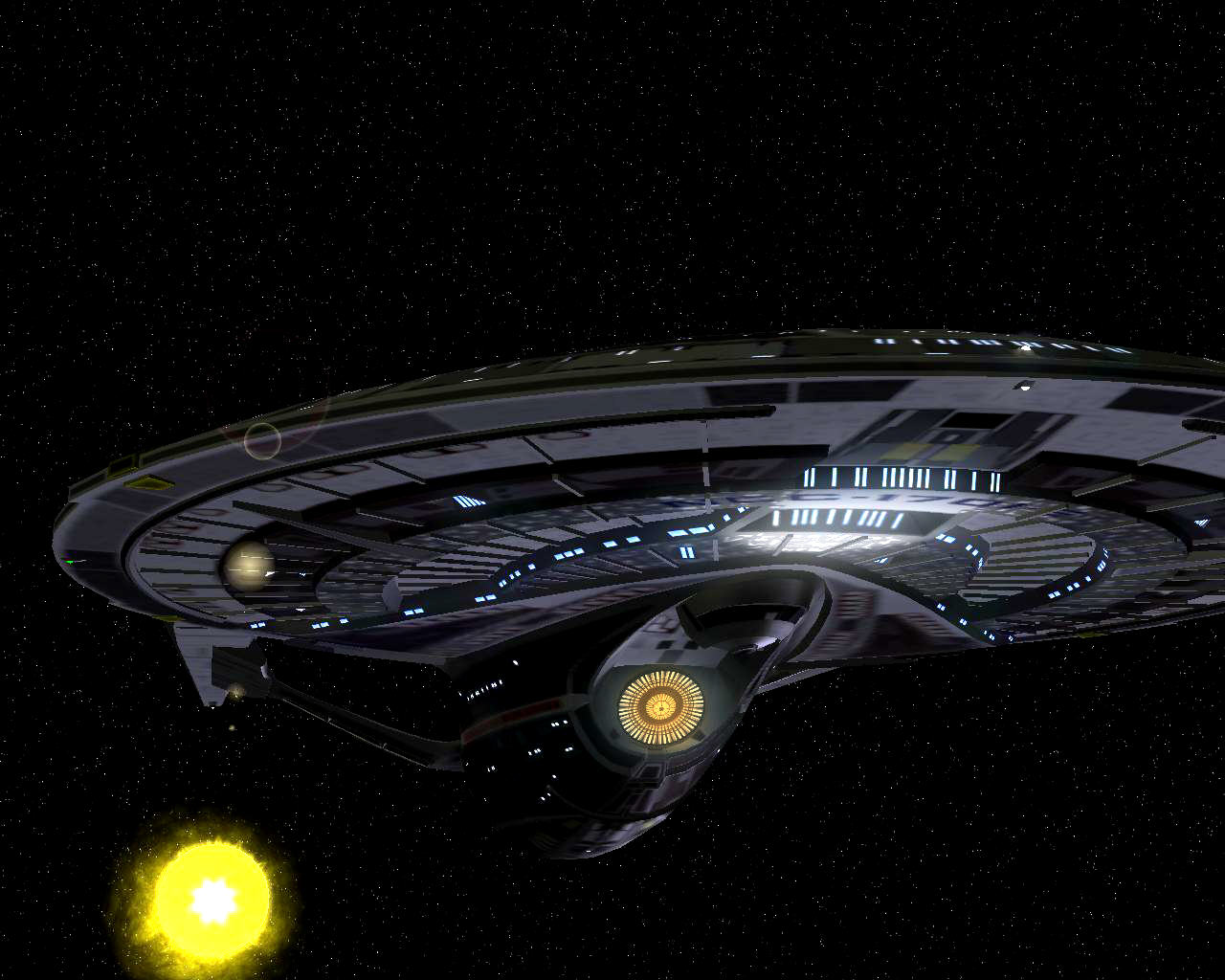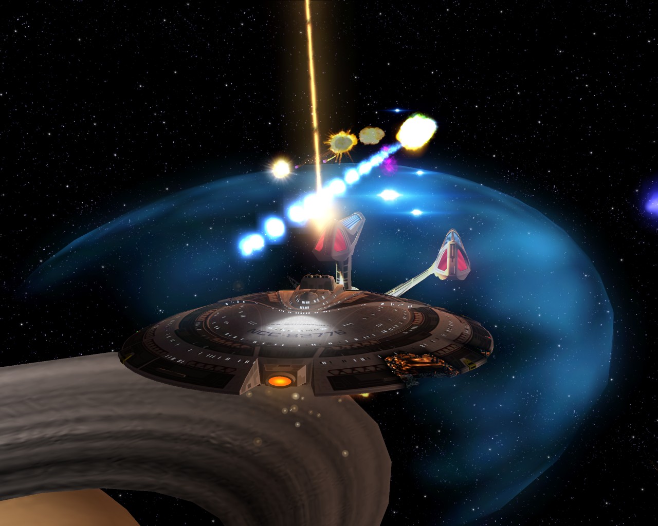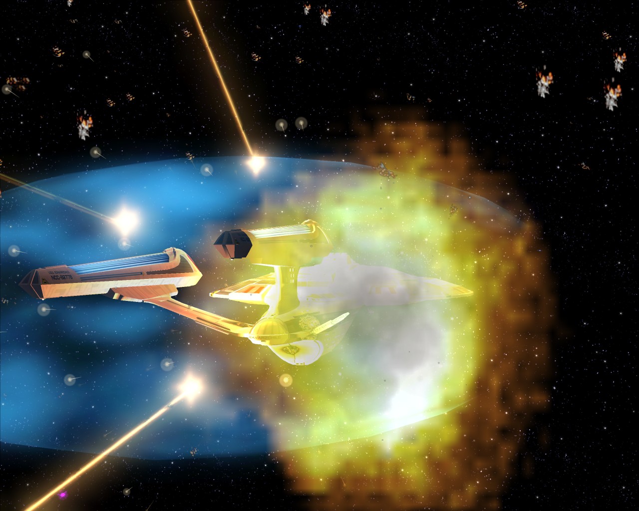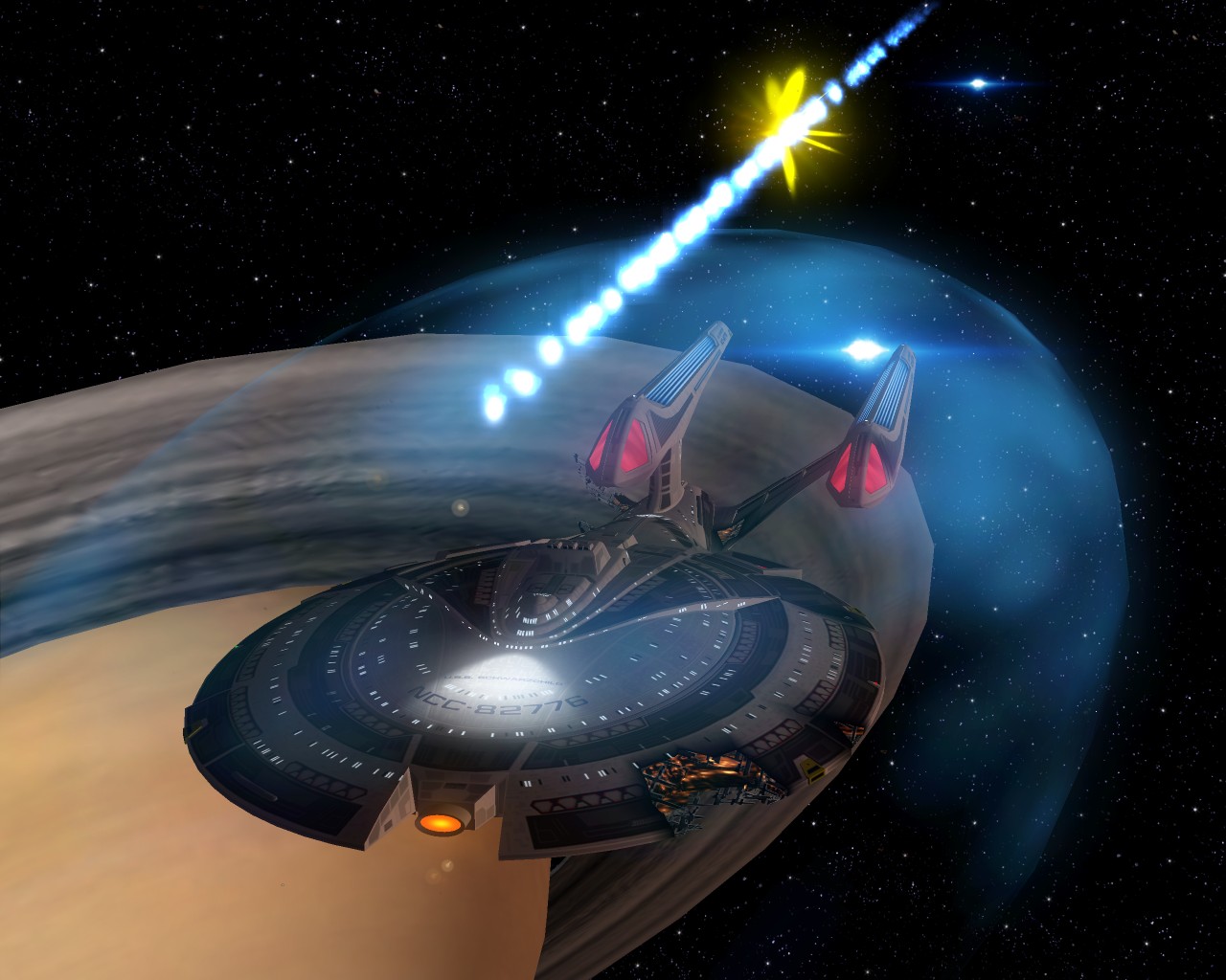 Bevor ich die Bilder mit der Prometheus gemacht hatte, testete ich ein neues Schiff "die NCC-1701-A Ghost". Sprich ein Geisterschiff, vergleichbar mit dem Segelschiff der Piraten aus Pirates of the Caribbean. Das hat auch ziemlich heftige Waffen. Ich war nämlich mit einem Schiff der Saber Klasse unterwegs und mit den ersten 2 Phaserschüssen hatte das Geisterschiff mein vorderes Schutzschild vollkommen ausgeschaltet. Die nachträglichen Photonentorpedos haben mich dann auf der Stelle zerstört.