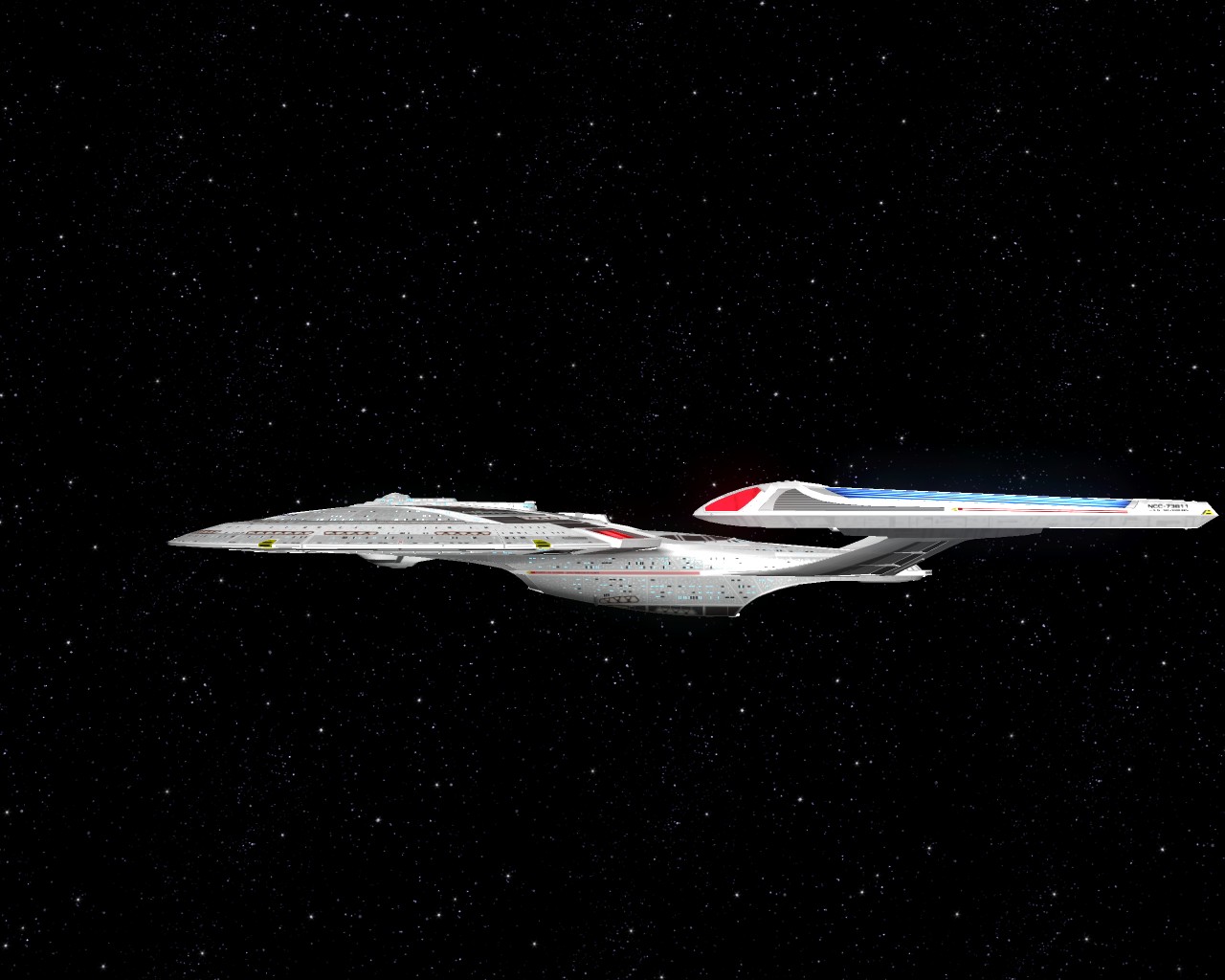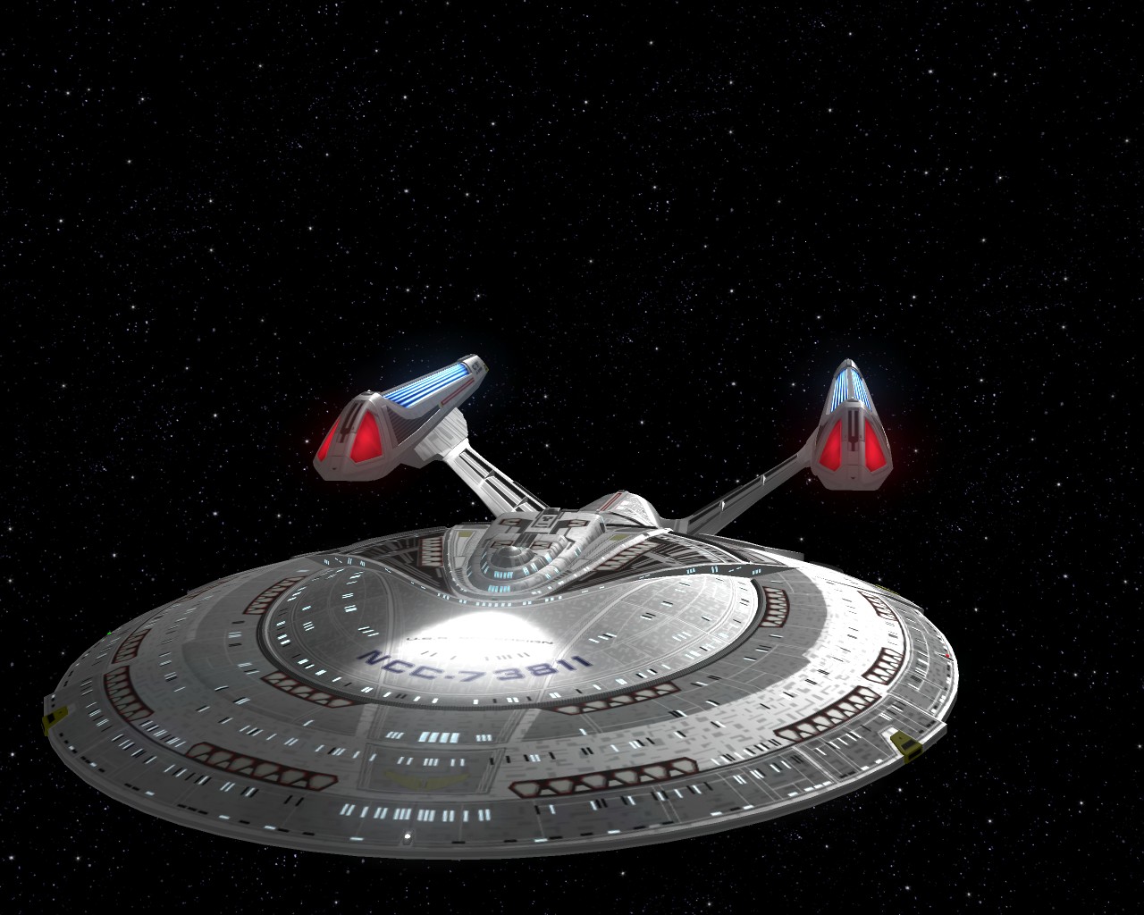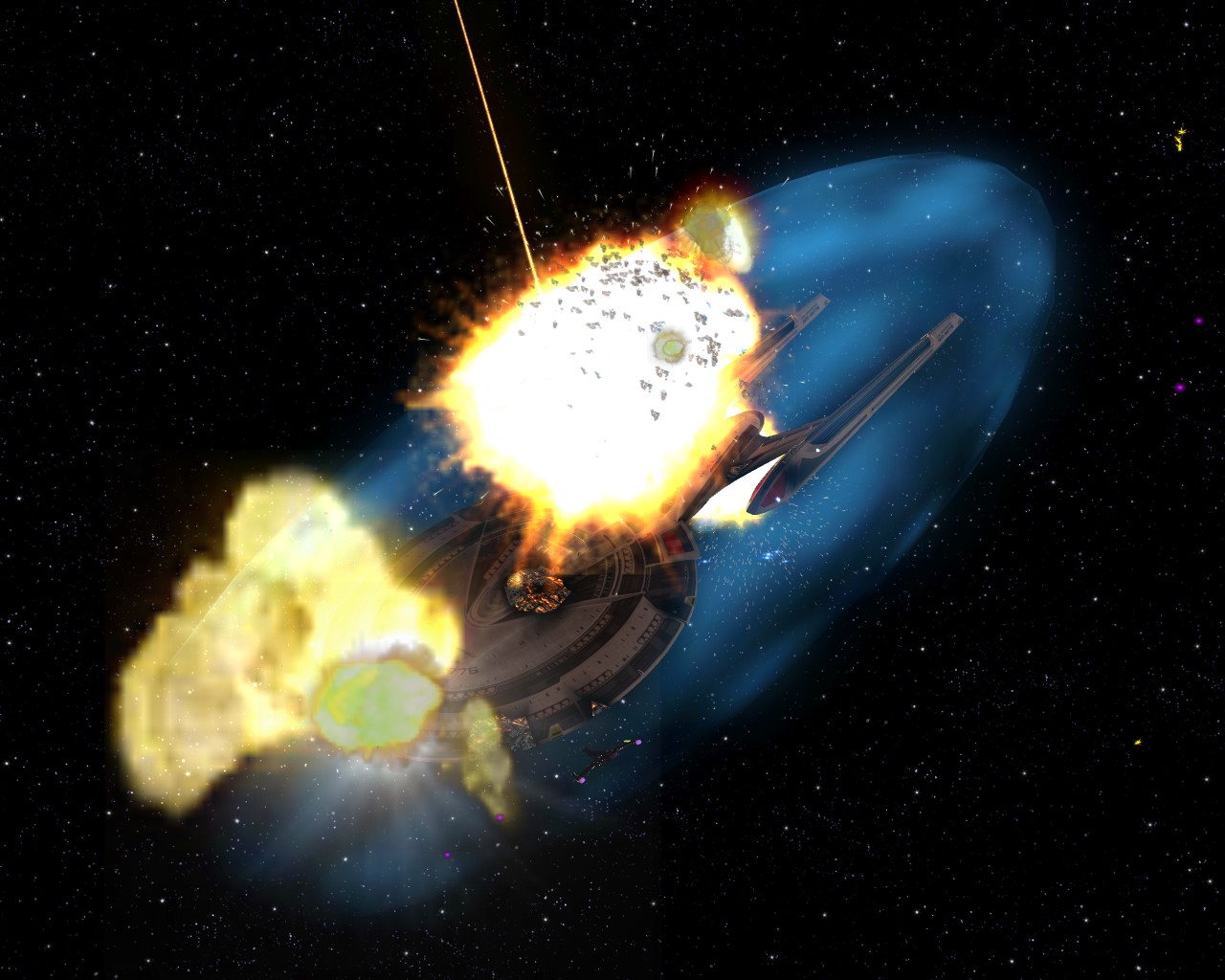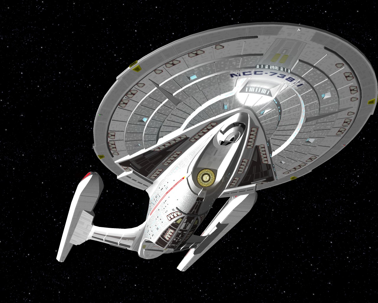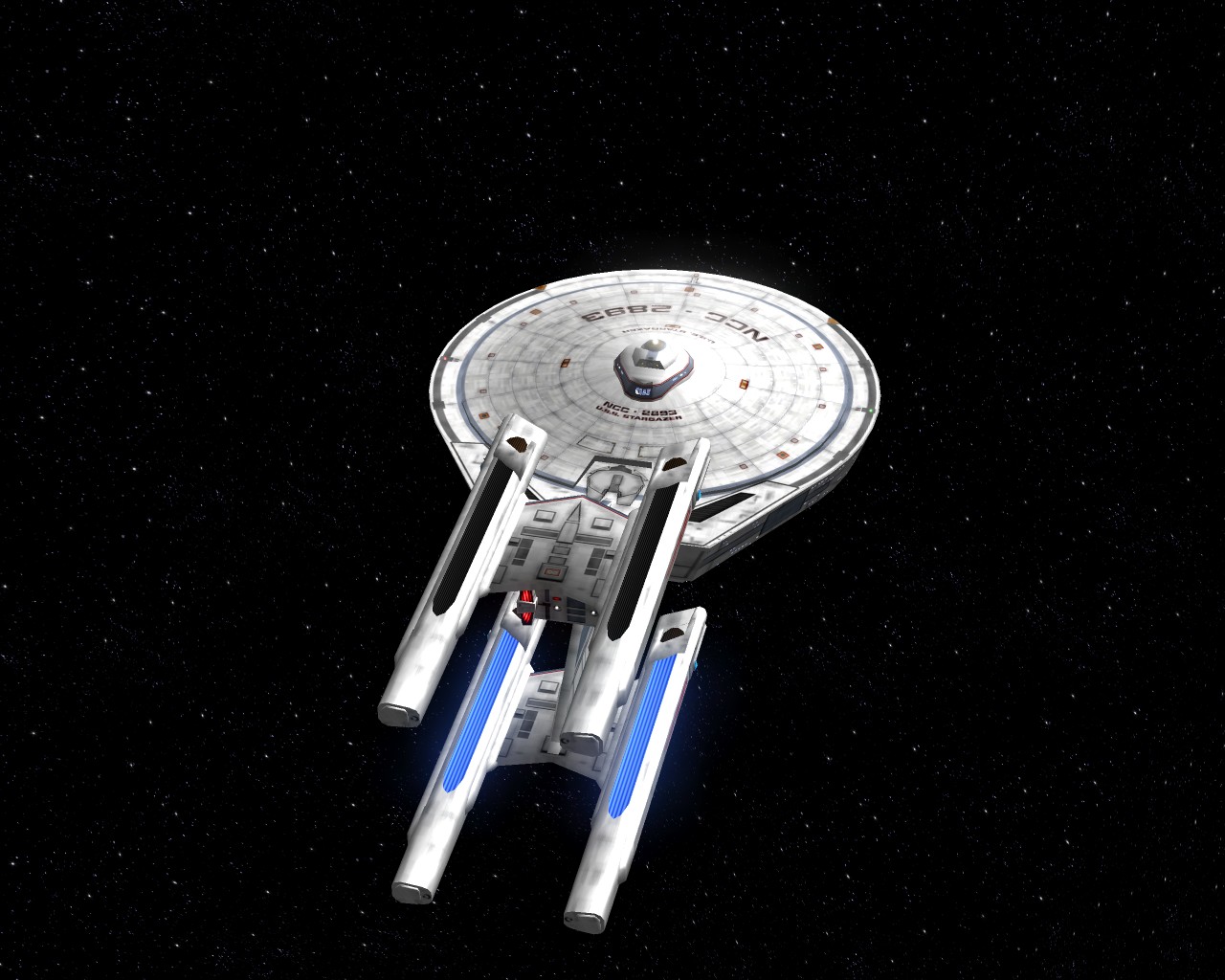 Bevor ich die Bilder mit der Prometheus gemacht hatte, testete ich ein neues Schiff "die NCC-1701-A Ghost". Sprich ein Geisterschiff, vergleichbar mit dem Segelschiff der Piraten aus Pirates of the Caribbean. Das hat auch ziemlich heftige Waffen. Ich war nämlich mit einem Schiff der Saber Klasse unterwegs und mit den ersten 2 Phaserschüssen hatte das Geisterschiff mein vorderes Schutzschild vollkommen ausgeschaltet. Die nachträglichen Photonentorpedos haben mich dann auf der Stelle zerstört.