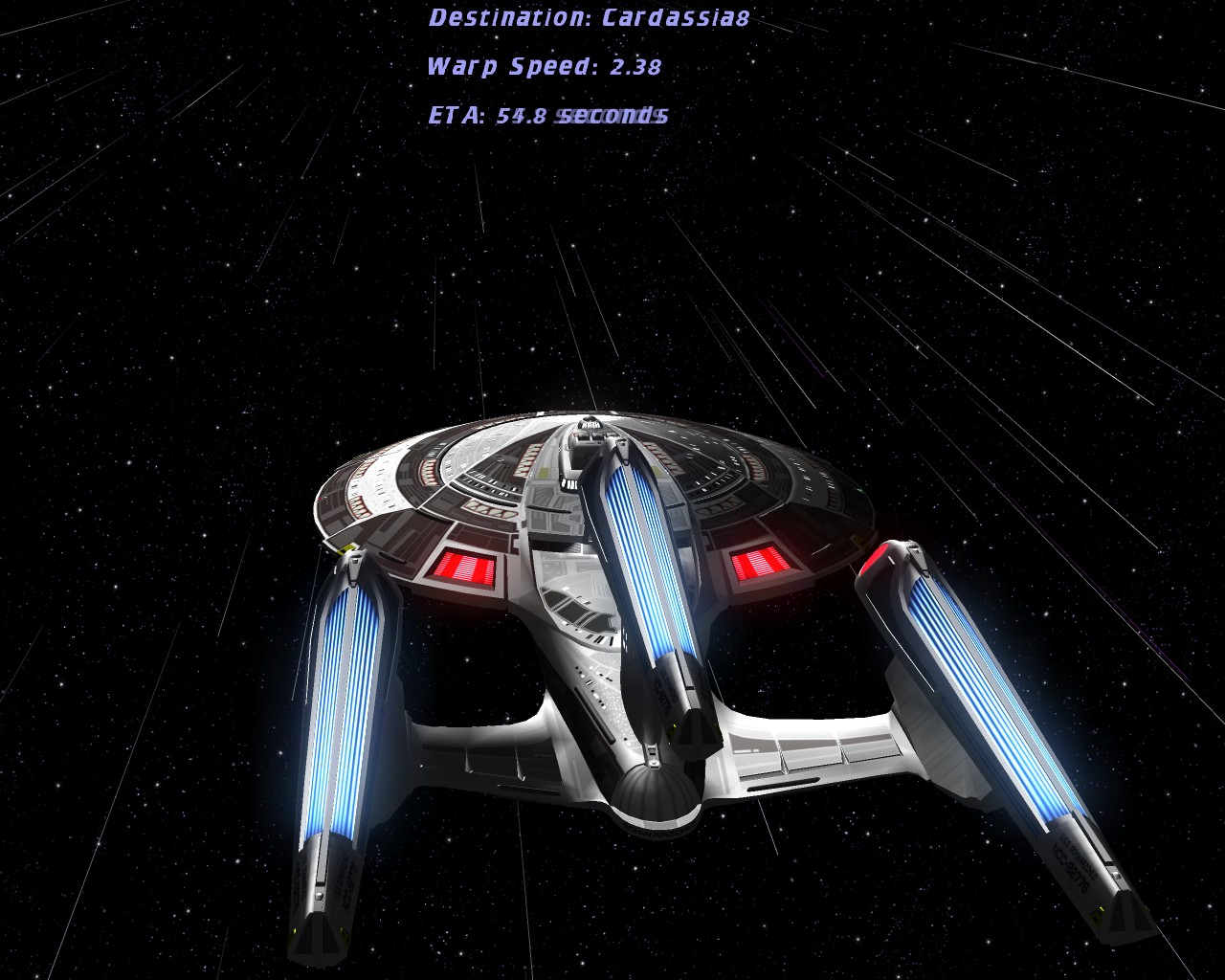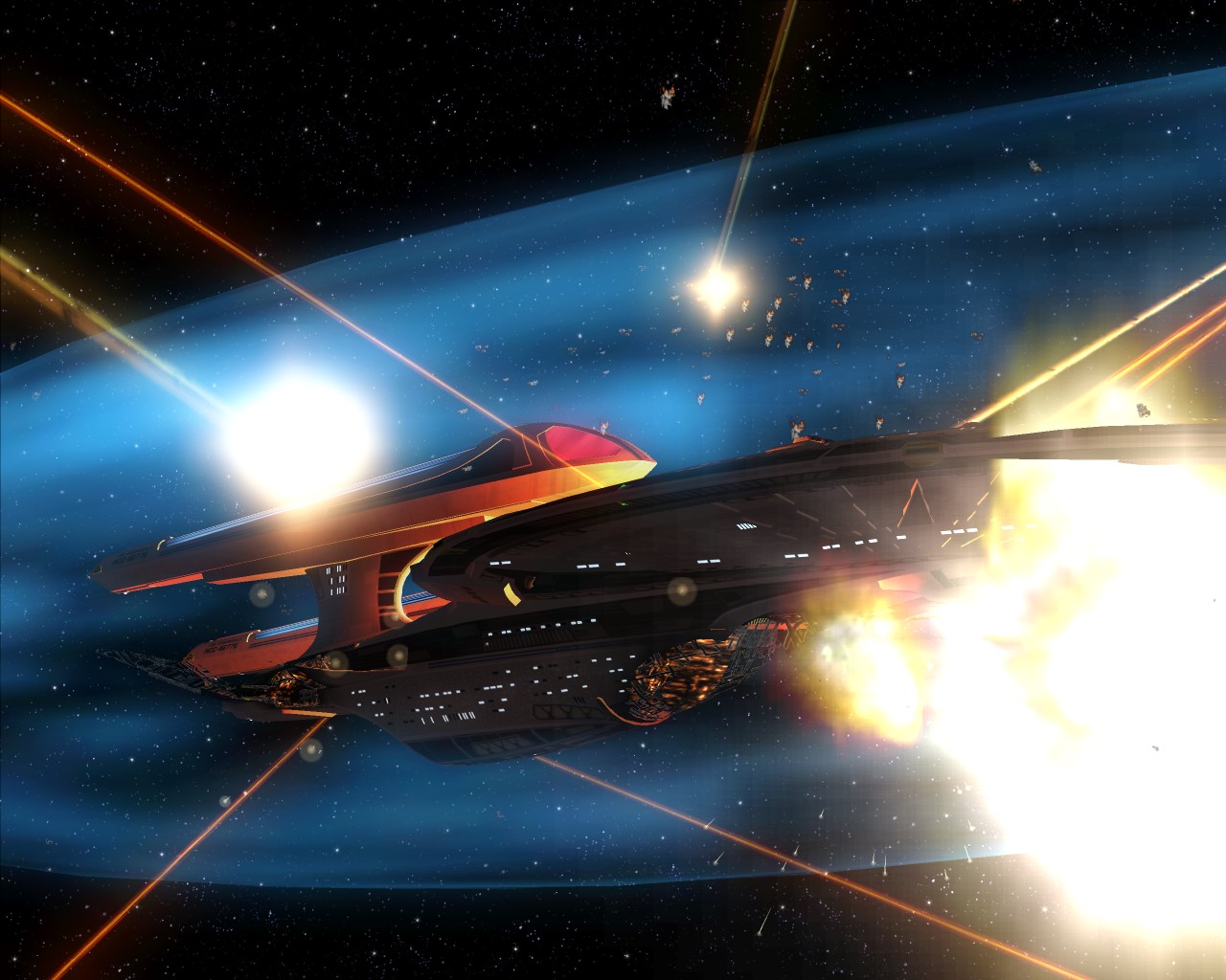 Bei den vier letzten Bildern, wo die Prometheus auf Warp ist, war ich auf dem Weg in das System von Cardassia. Dieses Volk ist der Föderation ja bekanntlich nicht freundlich gesinnt, weswegen ich in dem System auch von einer Armada der Cardassianer attackiert wurde. Also ich gegen 10 - 15 Schiffe, was schon etwas unfair ist.