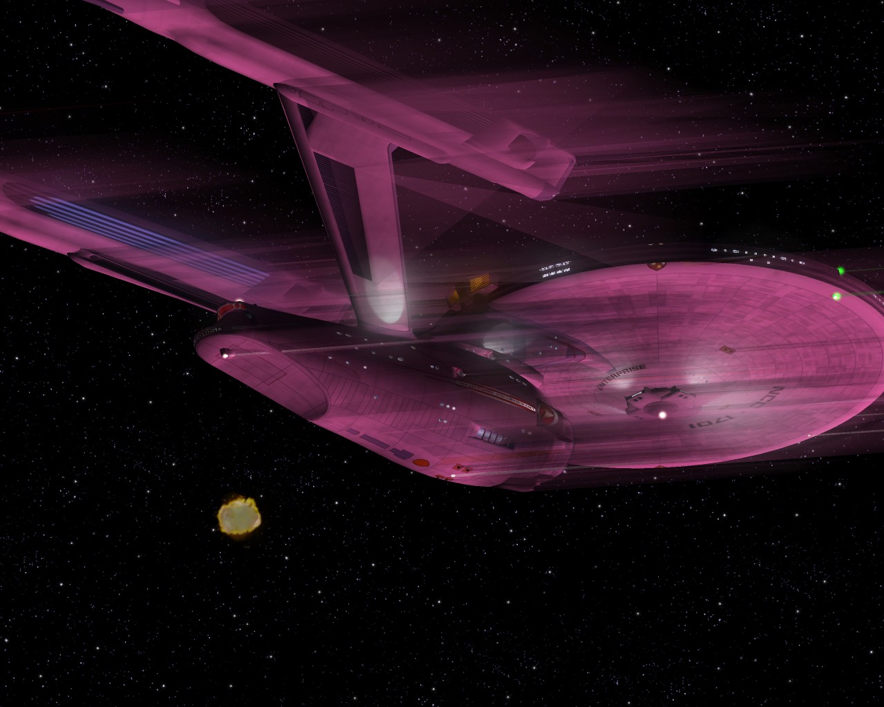 Falls du den Schaden an dem Schiff erzeugst, bzw. die Hülle durchlöcherst, würde ich dir am Ende noch raten, am Rand des Hüllenbruchs etwas mit den Phasern die Hülle anzuschwärzen. Die Enterprise ist in der Picture Story ja einer heftigen Explosion an der Hülle ausgesetzt gewesen