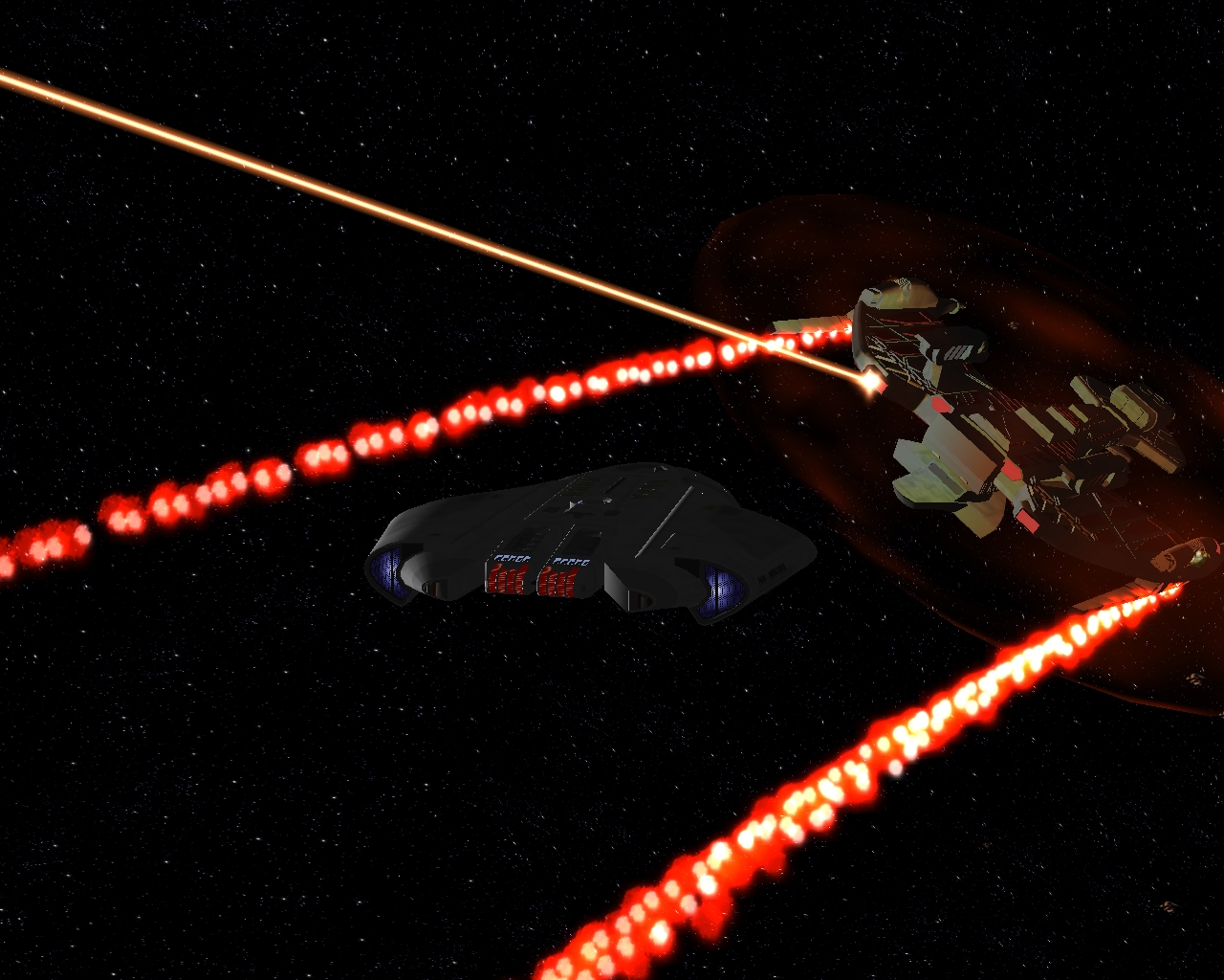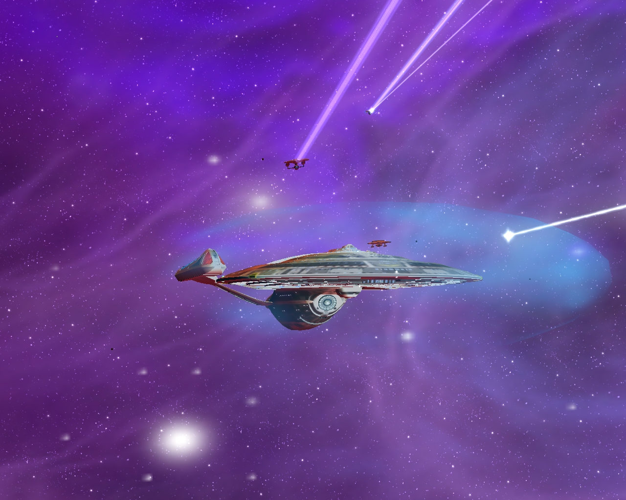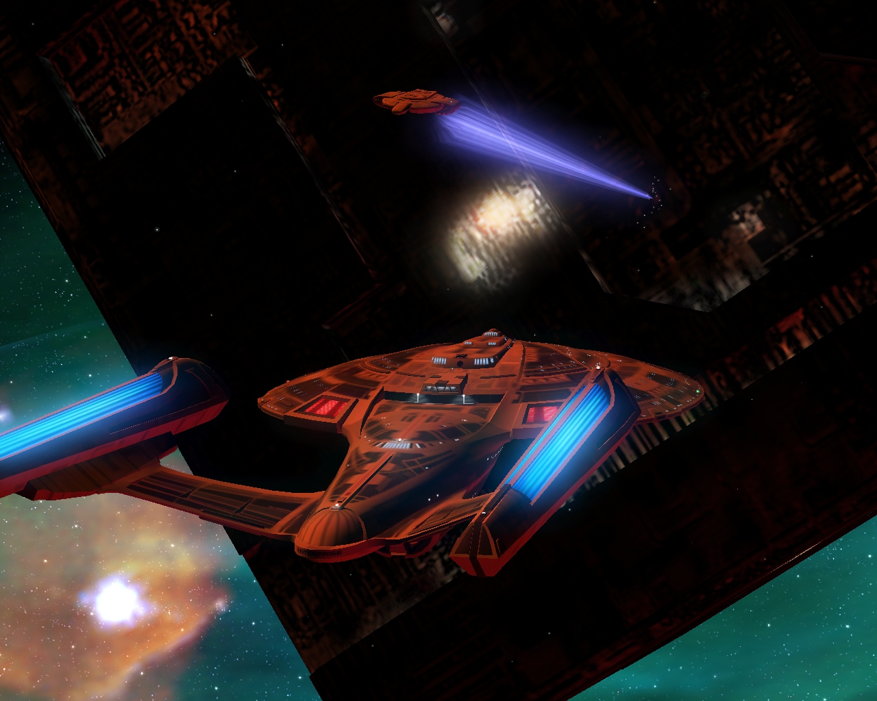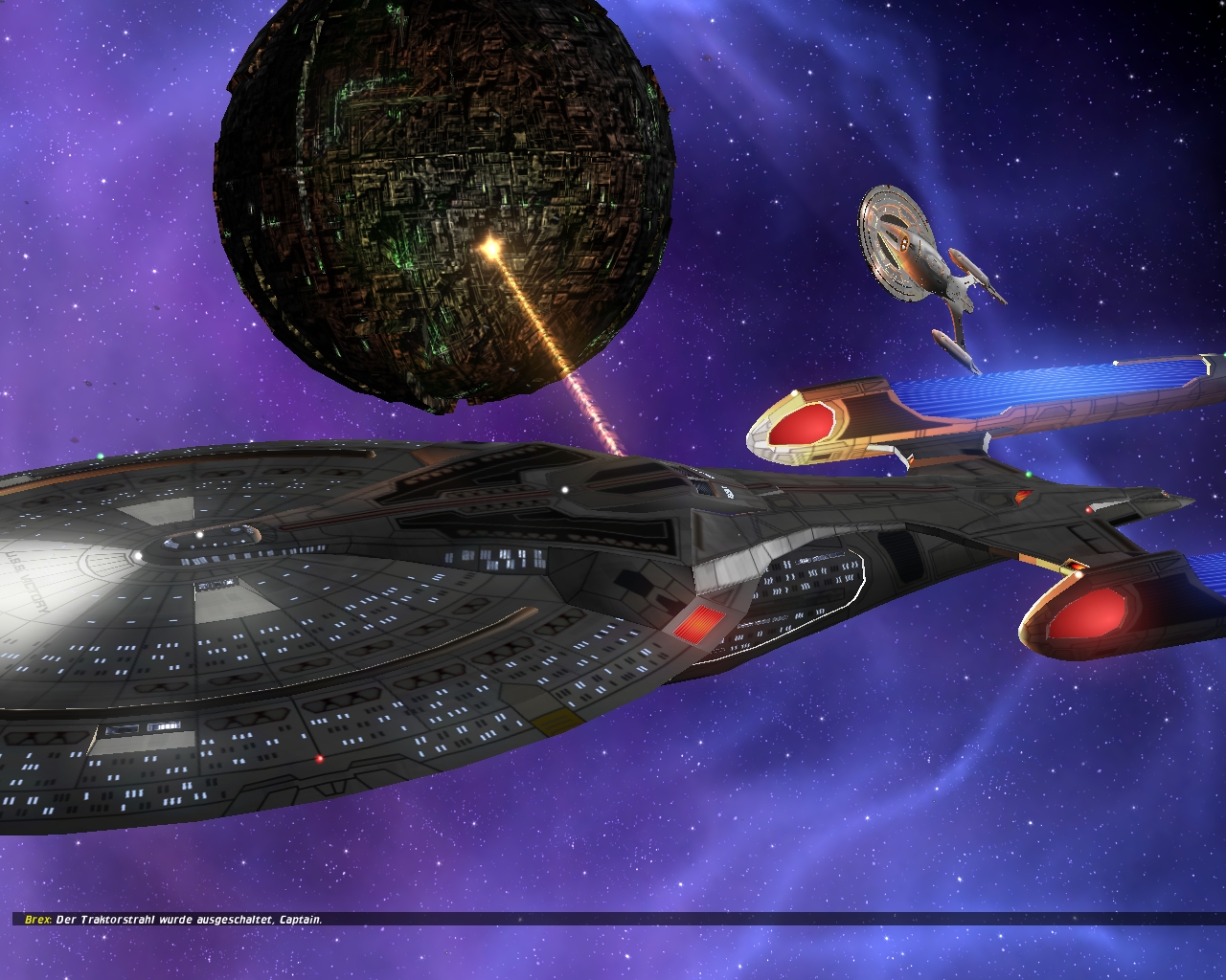 Einmal war auch eines der zwei Defaint Schiffe im Traktorstrahl und ich hab im Frontalanflug wie bei dem Film "ST Der erste Kontakt" mit einer Salve Photonen- und Quantentorpedos den Traktorstrahl ausgeschaltet. Bei dem vorletzten Bild kann man das etwas sehen.