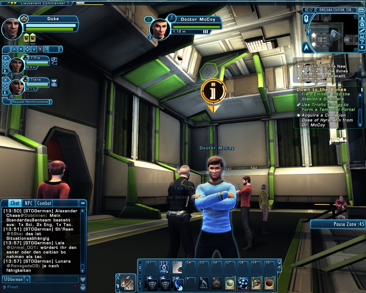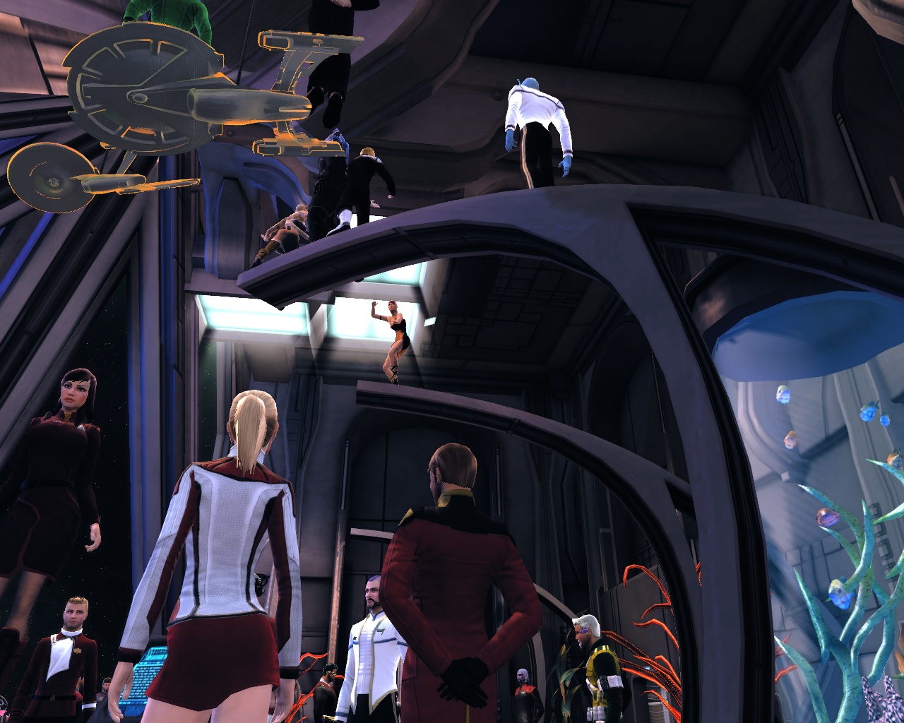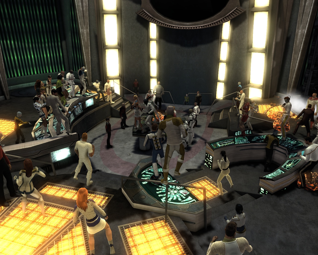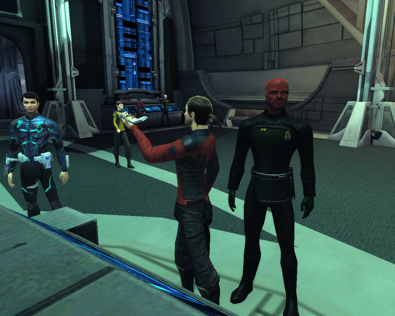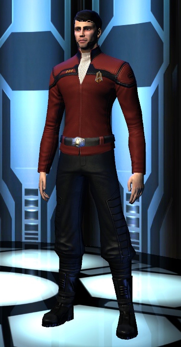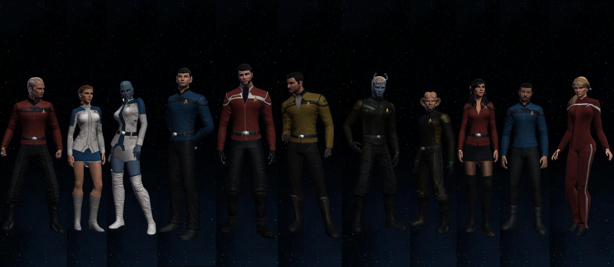 Sogar voll ins Schwarze getroffen. Die Brückencrew trägt das gleiche Uniformoberteil, lediglich bei der Wahl der Hosen gibt es da etwas mehr Freiheiten, die einzige Abweichung ist mein Captain. Die beiden weiß gekleideten Damen sind sozusagen mein medizinisches Team und die beiden etwas dunkleren Herren nehme ich als Special Ops-Crew gerne mit, wenns etwas ruppiger wird auf Außeneinsätzen. (also in STO meistens )