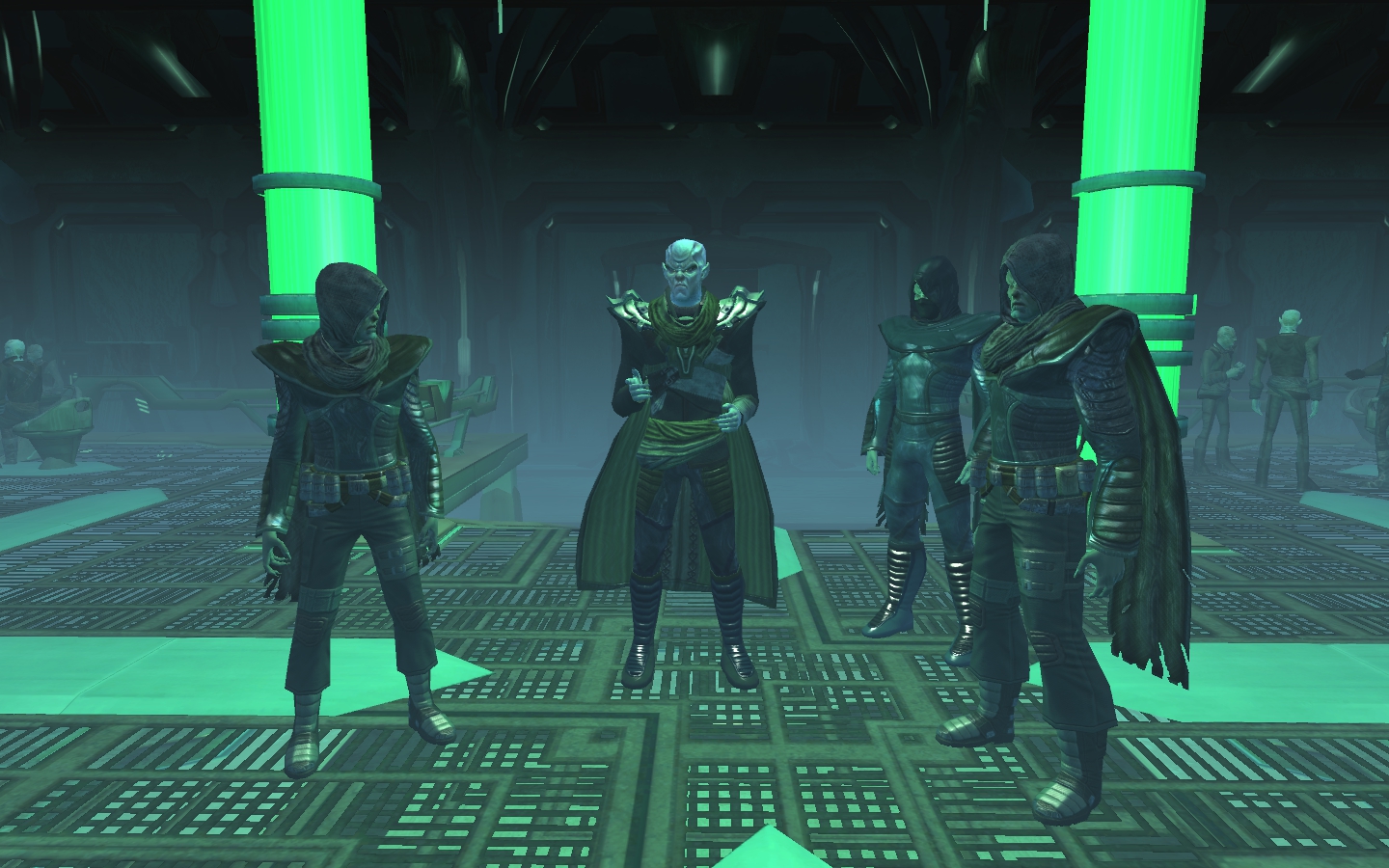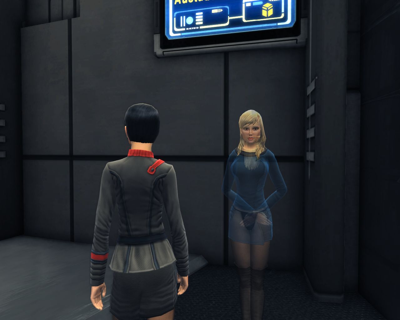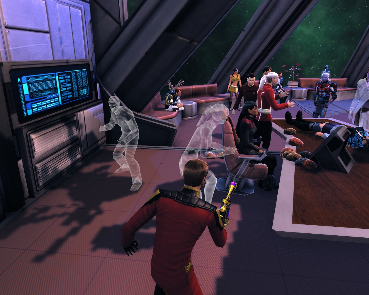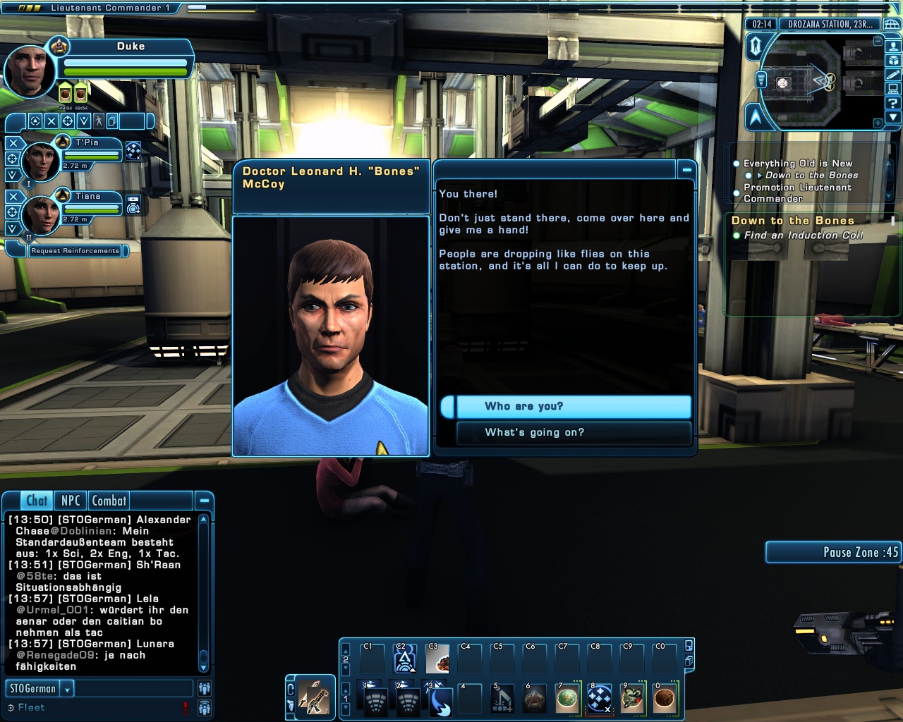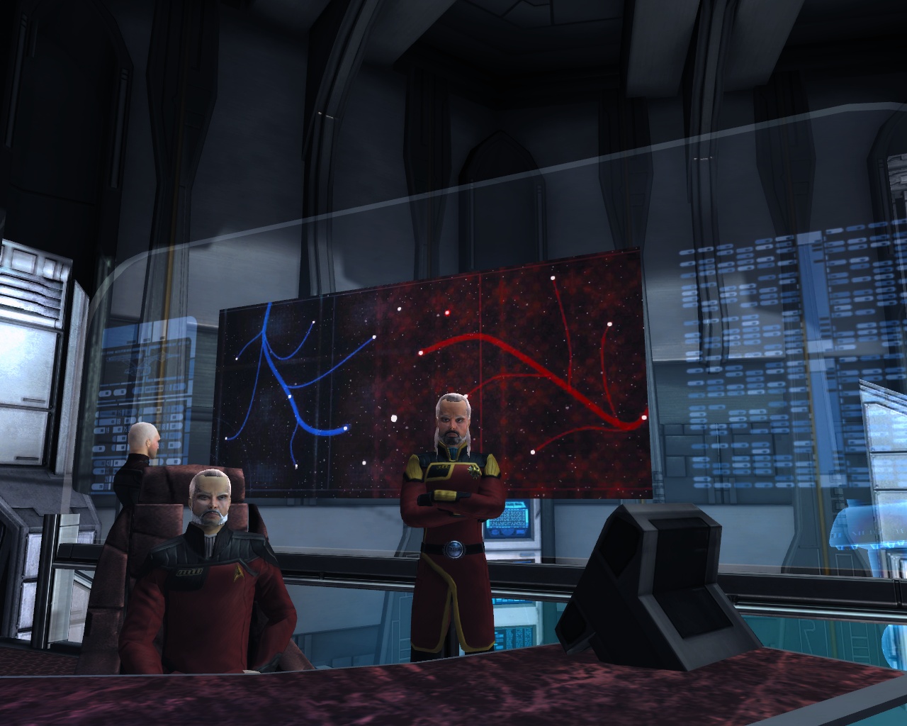 Sogar voll ins Schwarze getroffen. Die Brückencrew trägt das gleiche Uniformoberteil, lediglich bei der Wahl der Hosen gibt es da etwas mehr Freiheiten, die einzige Abweichung ist mein Captain. Die beiden weiß gekleideten Damen sind sozusagen mein medizinisches Team und die beiden etwas dunkleren Herren nehme ich als Special Ops-Crew gerne mit, wenns etwas ruppiger wird auf Außeneinsätzen. (also in STO meistens )