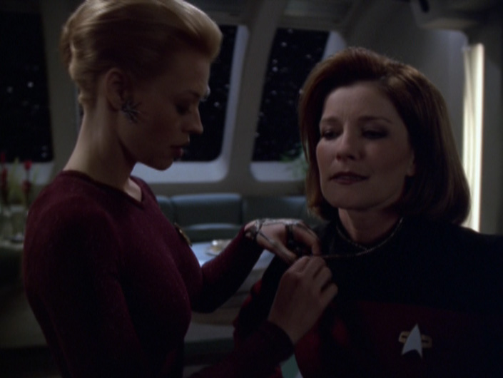 Ok, wo sieht man diese sehr anzügliche Szene, wo Seven Janeway beim "Anziehen" hilft?! Für den Moment hat es wirklich eine Art erotischen Charakter, wenn man sich die Gesichtsausdrücke und die Haltung ansieht, findet ihr nicht?!