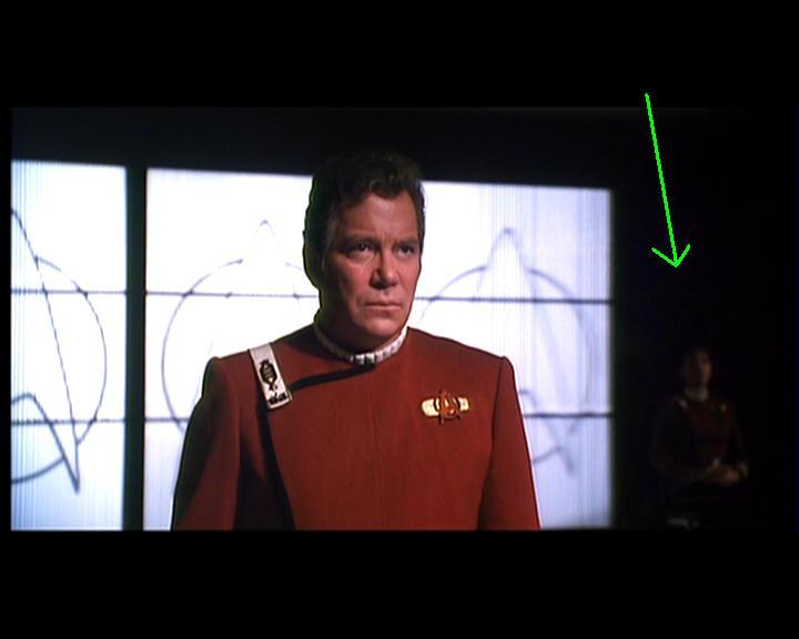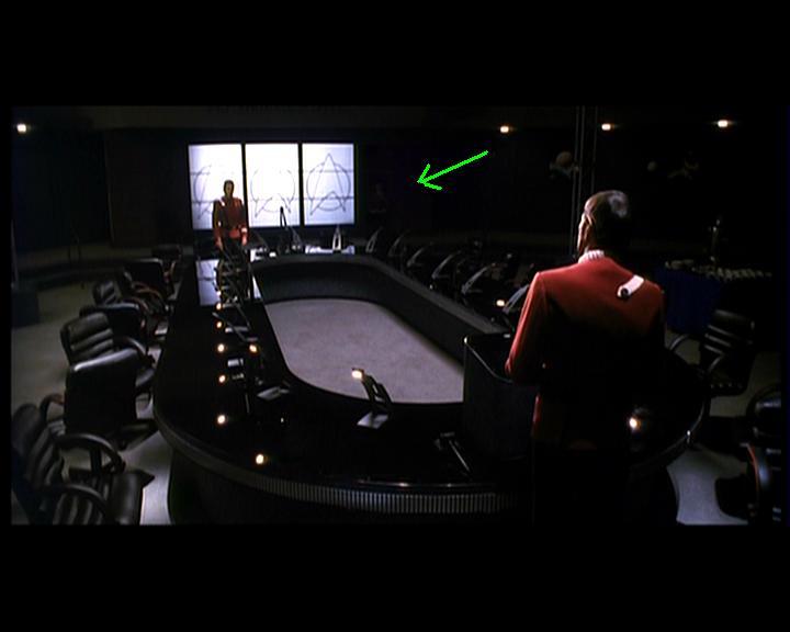 An der Wand hinter Kirk, die mit dem Starfleet Logo, steht ein Offizier, den man kaum erkennen kann. Hierbei handelt es sich um Lt. Valeris.