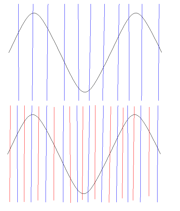 Wenn man die Frequenz verringert, nimmt laut Skizze der Raum zu.