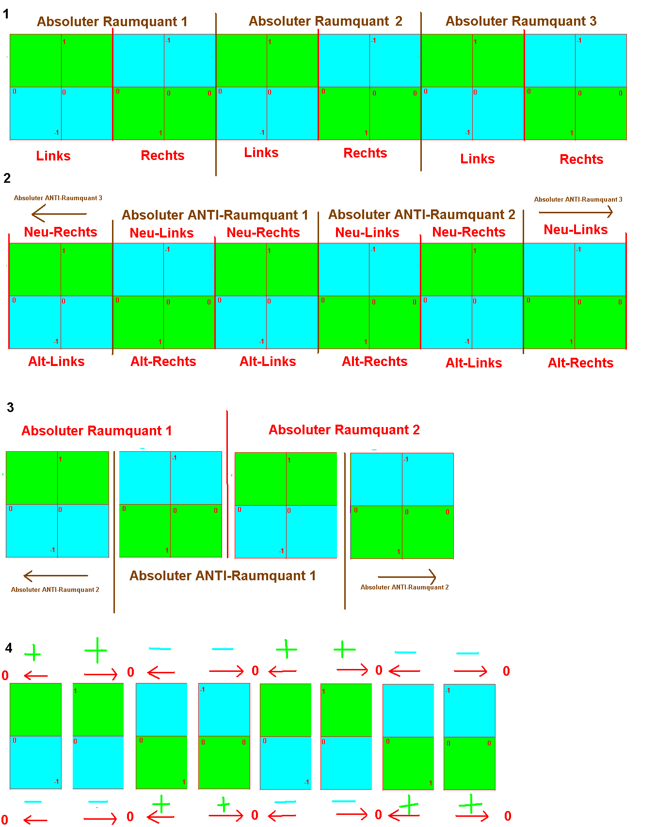 2. Betrachtet man die Mitte der Raumquanten, so fällt einem auf, das INNERHALB der absoluten Raumquanten, absolute ANTI-Raumquanten existieren. Um den Unterschied zu zeigen, habe ich sie in "Neu-Links/Neu-Rechts" geteilt.