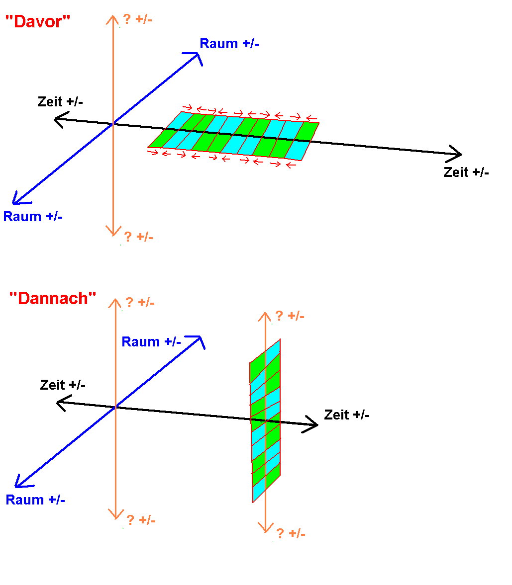Die blaue Linie ist die Haupterstreckung (Dimension) des Raums. Sie ist in BEIDE Richtungen PLUS UND MINUS, da wir Raumquanten auf BEIDEN SEITEN der NULL haben, die PLUS UND MINUS groß sind und ABSOLUT gesehen werden müssen, da sie nebeneinander liegen. AUF DIE ABS(OLUT)-Funktion kommt es an, wo was ist.