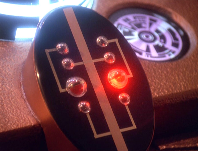 und hier sieht man Blinkelemente und eine Scheibe im Hintergrund, die auch eine Konsole zu seien scheint, vielleicht für Navigation, so wie bei der Enterprise, denn da sind die Steuerelemente auch kreisrund...