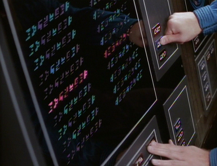 und hier tippt Riker etwas in eine Konsole, die auf Zeichen basiert, die in bestimmter Reihenfolge angeordnet, einen Befehl darstellen...oder es sind Knöpfe, um vorgefertigte Befehle aufzurufen....what ever...
