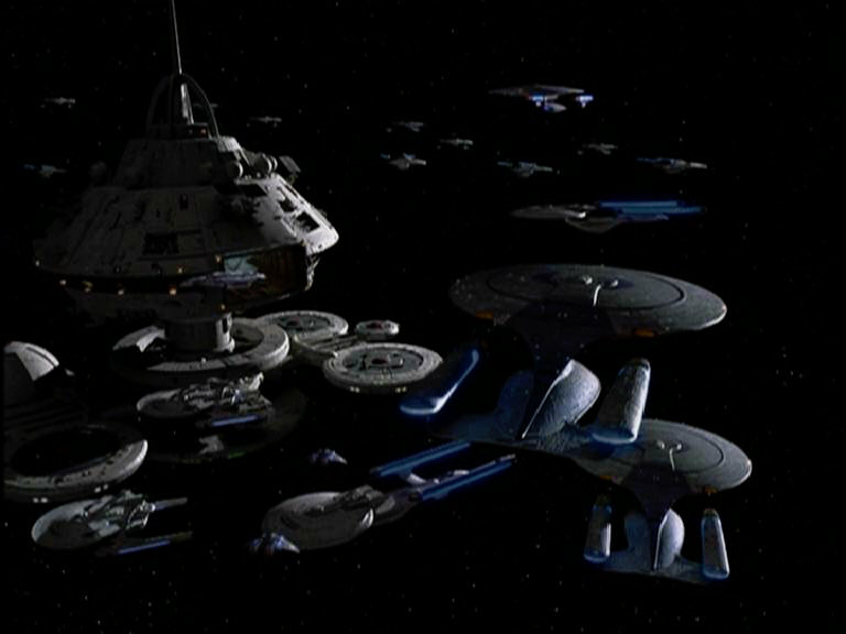 )Hier z.B. sieht man zwei Schiffe der Galaxy-Klasse mit einem dunkleren "Rücken". DIe Galaxy im hinteren Bereich hat wie ich das so sehe einen normalen blauen Deflektor.
