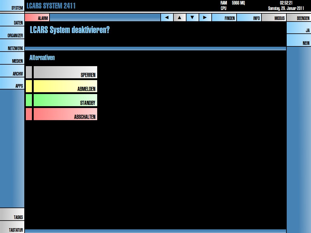 Eine Oberfläche im Star Trek LCARS-Style entwickeln, die die Windows Shell zum großteil ersetzt (zumindest bei mobilen Geräten soll das Ziel sein, nur noch die LCARS Oberfläche nutzen zu wollen). Kurz gesagt ein PADD. Später wenn ich endlich mal die richtige Hardware gefunden habe, soll es bei mir auf einem 7 Zoll Windows-UMPC unter einem abgespeckten Windows 7 laufen.