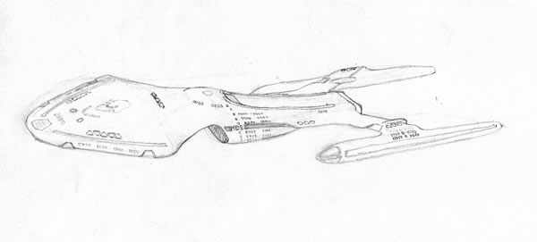 Abgesehen davon kann ich auf der Bleistiftskizze zumindest Rettungskapseln, Warpgondeln, Fenster, Messe, Brücke, Torpedos, Phaserbänke und Navigationsdeflektor erkennen.