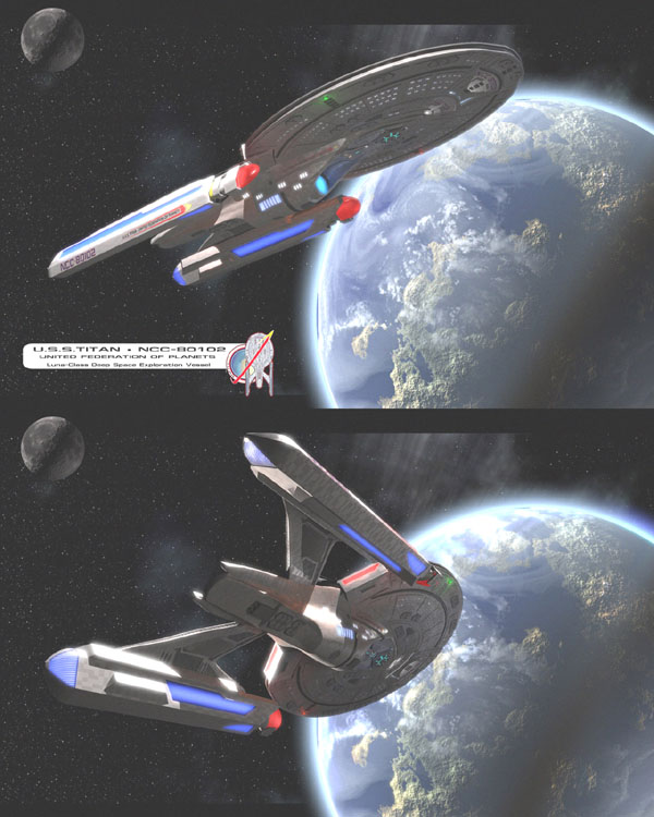 Das Waffenpotenzial ist nicht wirkliche bekannt. Aber im ersten Roman gibt es eine Kampfhandlung. Ich kann mich nicht an Details erinnern, aber ich kann mich erinnern, dass ich mir dachte, dass die Titan da ziemlich schwach gewirkt hat. Am Modell selbst kann man drei Phaserbanken erkennen, wobei die große auf der Unterseite der Untertassensektion dreigeteilt scheint. Was aber egal ist, da eine Phaserbank auch ohne diese Teilung mehrere Strahlen abfeuern kann. Torpedorohre sieht man zwei nach hinten und zwei nach vorne gerichtet. Quantentorpedos hat die Titan an Bord, aber die Anzahl ist unbekannt und ob alle Torpedowerfer QTs abfeuern können.