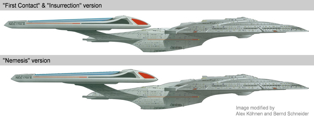 Ich bin letztens beim Surfen durch die unendlichen weiten des internets auf ein interessantes bild gestoßen, das mich sehr gewundert hat. Laut diesem Bild soll die Enterprise-E aus Nemesis einen anderen aufbau haben als die Enterprise aus der erste kontakt un der aufstand. es sind zwar minimale veränderungen, aber im gesamtbild erkennt man den unterschied.