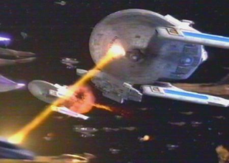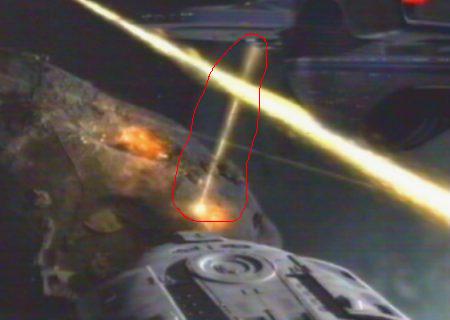 Mittlerweile ist mir klar, worauf du hinaus willst...das was du als Phaser der Miranda-Klasse auslegst, ist ein cardassianischer Spiralwellendisruptor, der dieses Schiff auf der Unterseite trifft. Wenn du die Szene nämlich weiterverfolgst, wirst du merken, dass dieses Schiff genau an dieser Stelle zerrissen wird.
