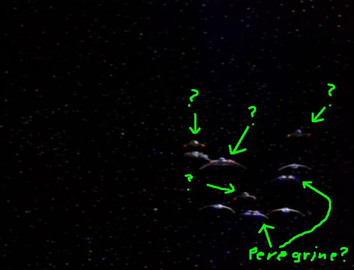 aber hier ist die kleine Armada und da sind Bajorjäger, Maquis Rider und noch eine andere Klasse wobei es sich tatsächlich um Peregrines handeln könnte...
