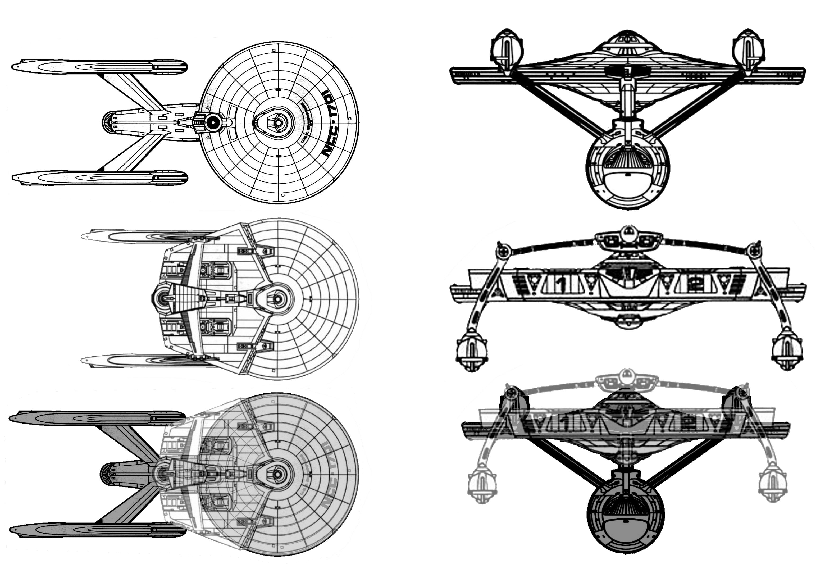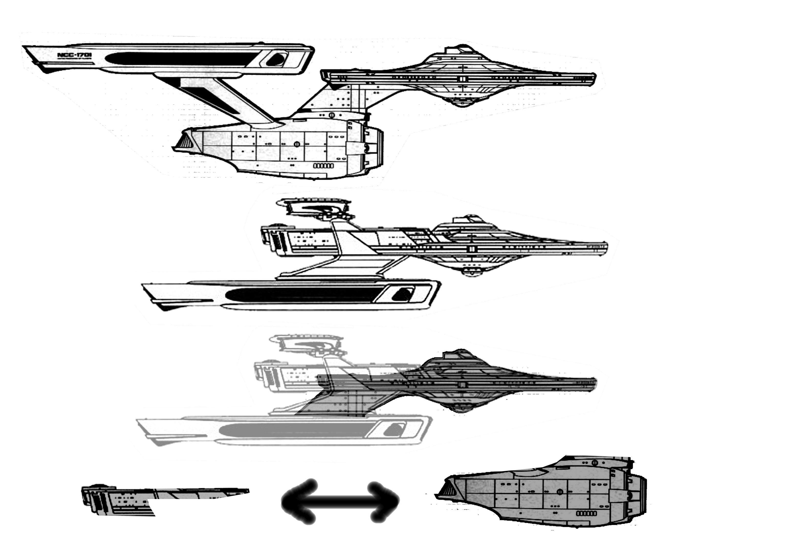 Ich denk auch mal, dass das mit dem Sekundärrumpf bei beiden Schiffen gewaltig täuscht. Hier mal ne Gegenüberstellung die ich unter der Bedingung zusammengesetzt hab, das Untertasse und Gondeln identisch sind.: