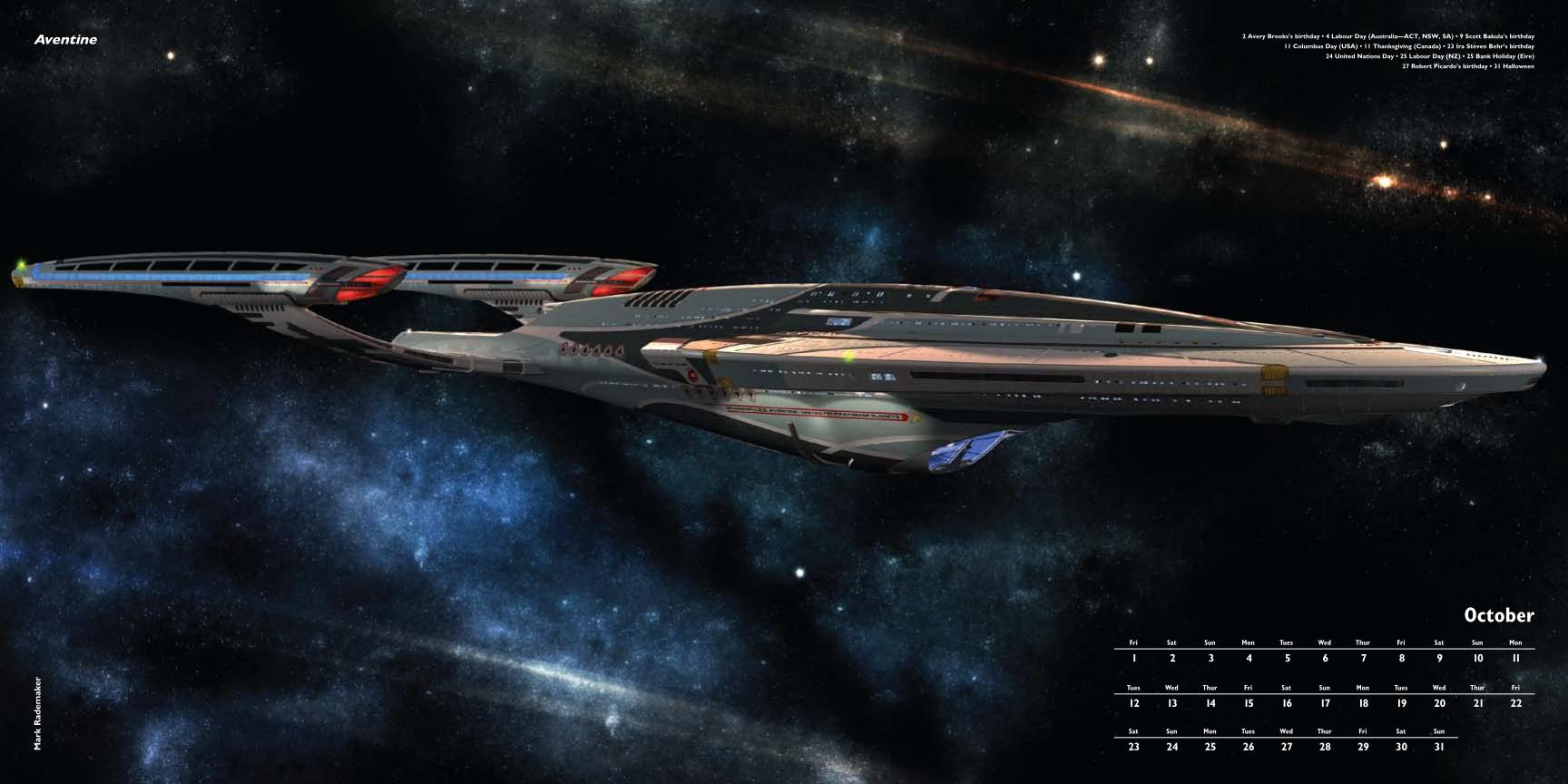 Ein Bild aus dem neuen Ships of the Line-Kalender für 2009. Ob es wirklich die Aventine ist, weiß ich nicht, aber das Bild heißt "Around the Quadrant in Eighty Days", es würde mich also nicht wirklich überraschen, wenn das Bild eine versteckte Andeutung auf die kommende Destiny-Trilogie ist, es wäre ja bekanntermaßen nicht das erste (Das Bild der abgestürzten NX-Columbia aus dem 2008-Kalender wird sich ja bekanntermaßen in der Handlung von Kobayashi Maru und Destiny 1 wiederfinden).