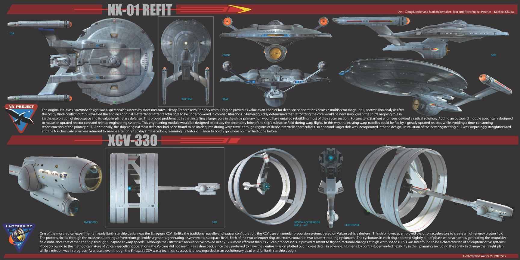 Das stimmt nicht vollständig. Matt Jeffries hat zwar für TOS auch Entwürfe gemacht, die der XCV-330 geähnelt haben. Das Schiff, das auf dem Bild in ST1 zu sehen ist, war aber ursprünglich Anfang der 70er für eine andere nie realisierte Roddenberry-Serie namens "Starship" von Jeffries gezeichnet worden. Der Einfachheit halber hat man bei der Erstellung der Galerie in ST1 dann einfach auf dieses Bild zurückgegriffen.