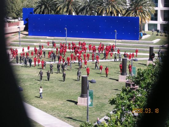 Hier gibt es einige Fotos von Filmdreharbeiten auf dem Gelände der Cal State Northridge Universität. Angeblich wird da ein Film gedreht namens "Corporate Headquarters". Aber mal ehrlich: Was die Leute da tragen, sieht doch ziemlich vertraut aus, oder?