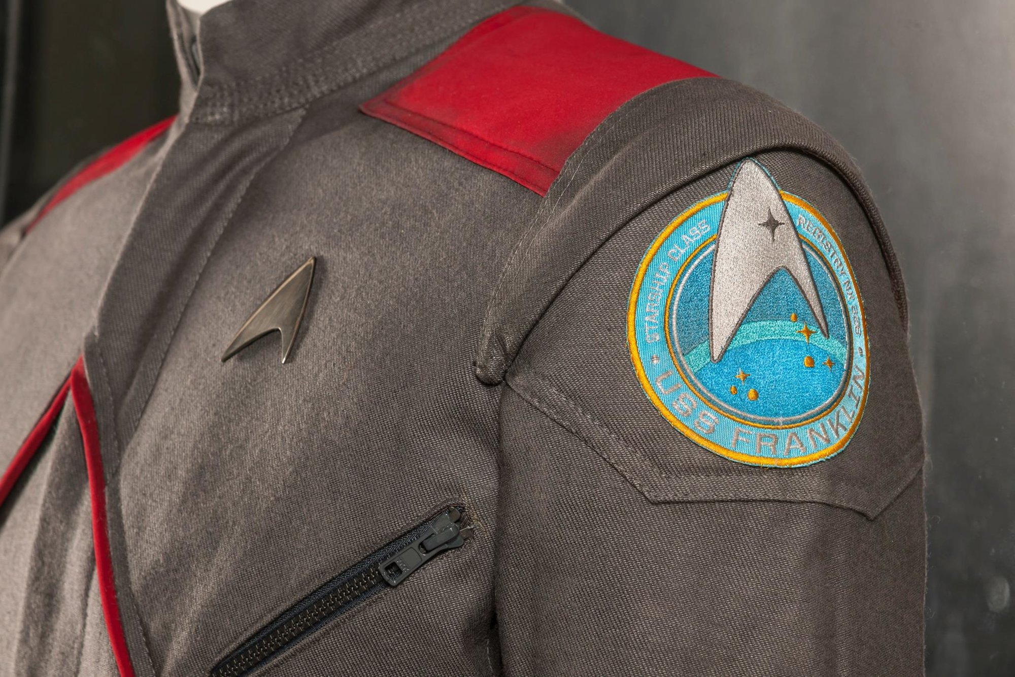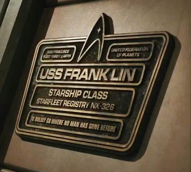 Ursprünglich trug die Franklin den Namen Pioneer. Den Namen Franklin erhielt das Schiff später in Anspielung auf den Namen von Regisseur Justin Lins Vater Frank Lin. Auf der Schiffsplakette auf der Brücke (siehe nächsten Post) kann man sogar ein halbes Leerzeichen im Namen ausmachen. Die Registriernummer NX-326 ist wiederum eine Anspielung auf Leonard Nimoys Geburstag (26. März im amerikanischen Datumsformat 3/26).