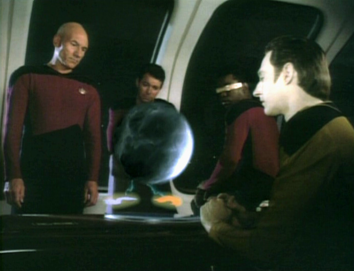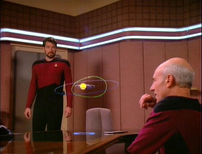 In den ersten beiden Staffeln gibt es sowohl in Picards Bereitschaftsraum wie auch im Konferenzraum holographische Projektionsflächen (Riker hat auch eine in seinem Quartier). Im Anhang sind ein paar Bilder mit den Episodennamen. Das sah recht praktisch aus und es ist s chade, dass man das nicht beibehalten wollte oder konnte.