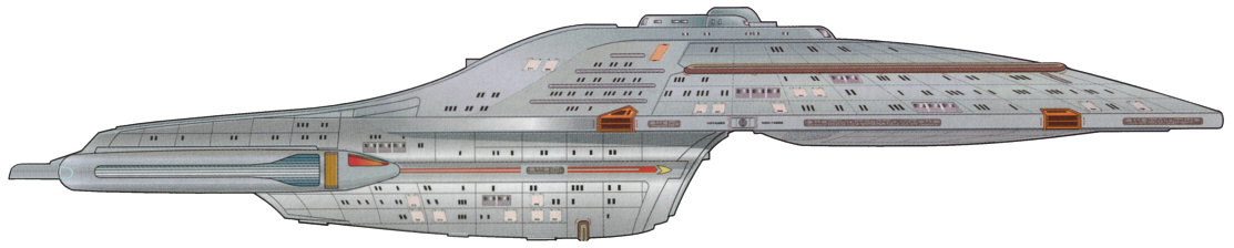 Gleich hinter DS9 sieht man dann ein Schiff (von vorne). Eine Excelsior kann es kaum sein, da man ja die Vergleichsmöglichkeit gleich mit im Bild hat.