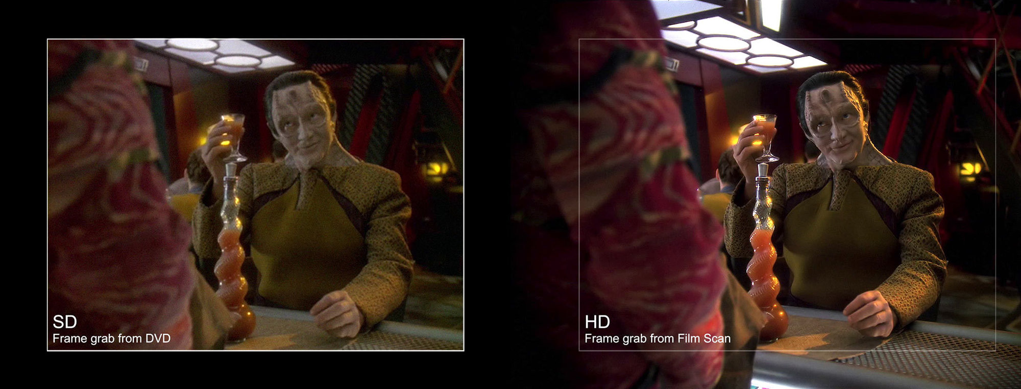 ich wäre nicht für 16:9 bei der serie, den ob und unten fehlt dann was. bei der grarak szene sieht man das auch gut.. das metal teil oben an der Tür hat ne ferengi aufschriftt, das würde in der 16:9 version fehlen... tng hd hat vorgemacht das aich 4:3 material in hd top aussieht... schade.das.ds9 nicht auf hd kommt..