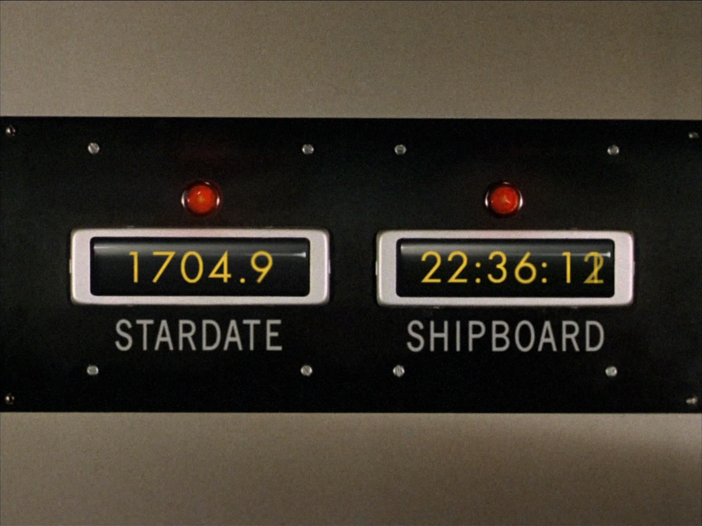 Beim Treffen mit der Kronos I schon. Man sieht die Begrüßung und da wird irgendwas mit 19 Uhr angezeigt. Kirk schlägt vor sich um 22:00 Uhr an Bord der Enterprise zu treffen. In der Dinnerszene sehen wir keine Uhrzeit. Später beim Anschlag zeigt die Borduhr irgendeine Zeit nach Mitternacht an. (Die Uhrzeiten stimmen nicht genau, aber so ungefähr habe ich es in Erinnerung).