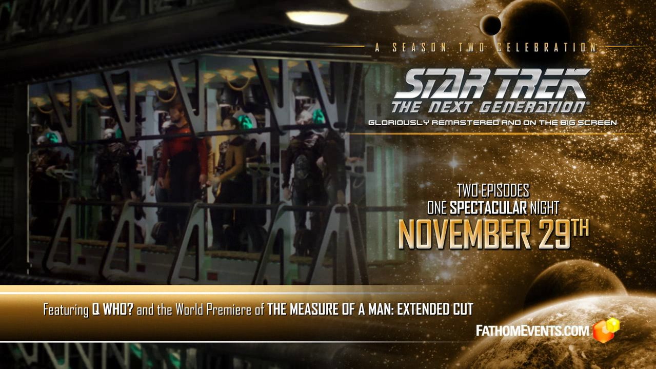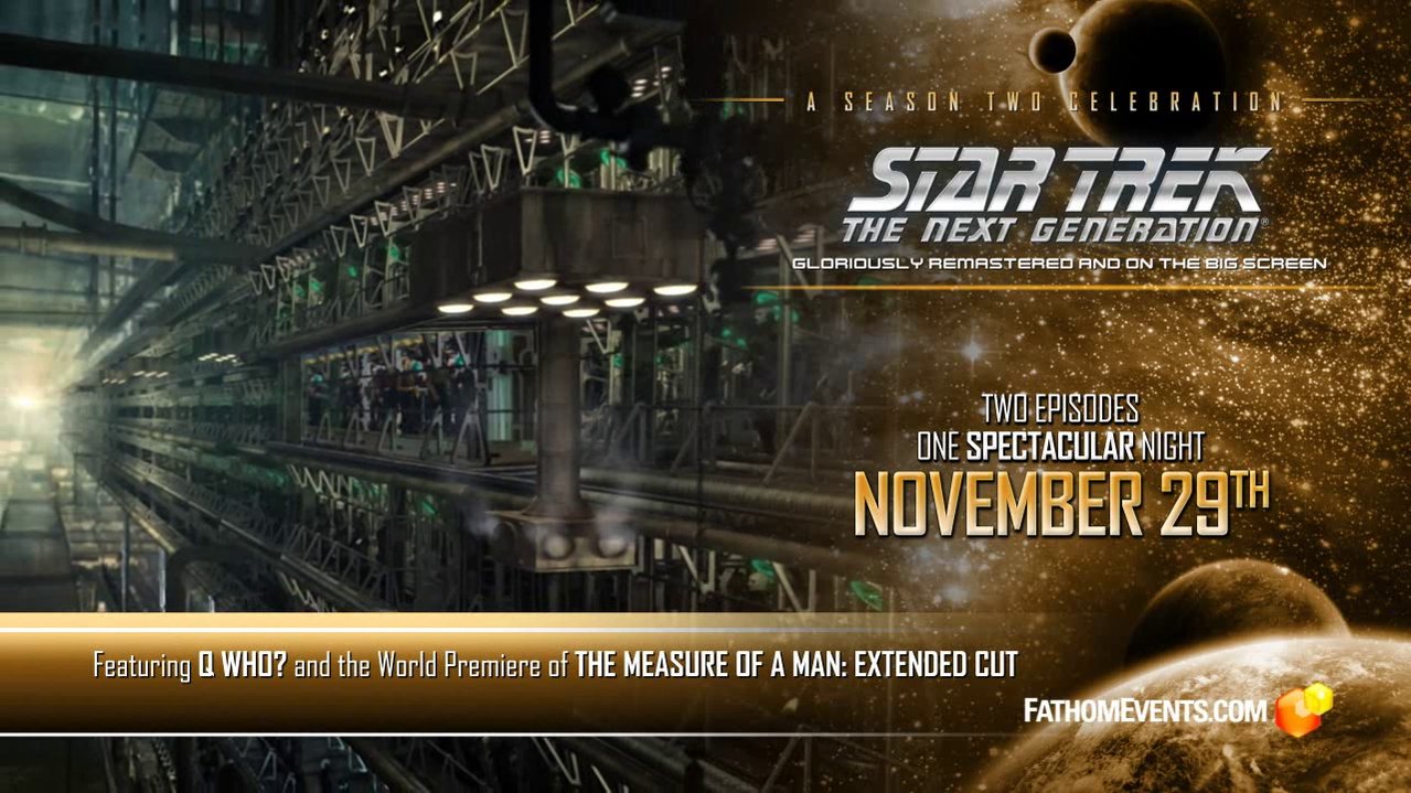 Gezeigt werden die Folgen "Zeitsprung mit Q" und die Langfassung von "Wem gehört Data". Im Trailer sieht man einen interessanten Ausschnitt aus der Episode "Zeitsprung mit Q". Dort gab es ja eine Szene, in der ein Außenteam auf den Borg-Kubus beamt und dieser Ausschnitt des Sets in ein damals sehr beeindruckend wirkendes Matte Painting eingefügt wurde. Hier ein Screenshot der Szene von der DVD: