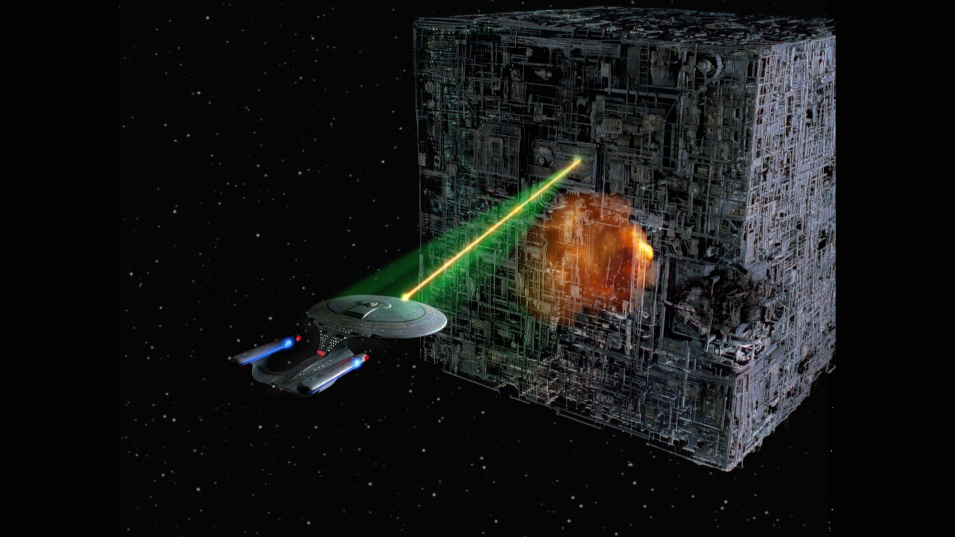 Trekweb.com hat auch ein Bild bekommen, und zwar jenes von der Enterprise und dem Borg-Kubus. Leider hat Trekweb keiner gesagt, dass man die Qulität eines HD-Bilds nicht wirklich vom Original unterscheiden kann, wenn man das HD-Bild so stark verkleinert. Dennoch: