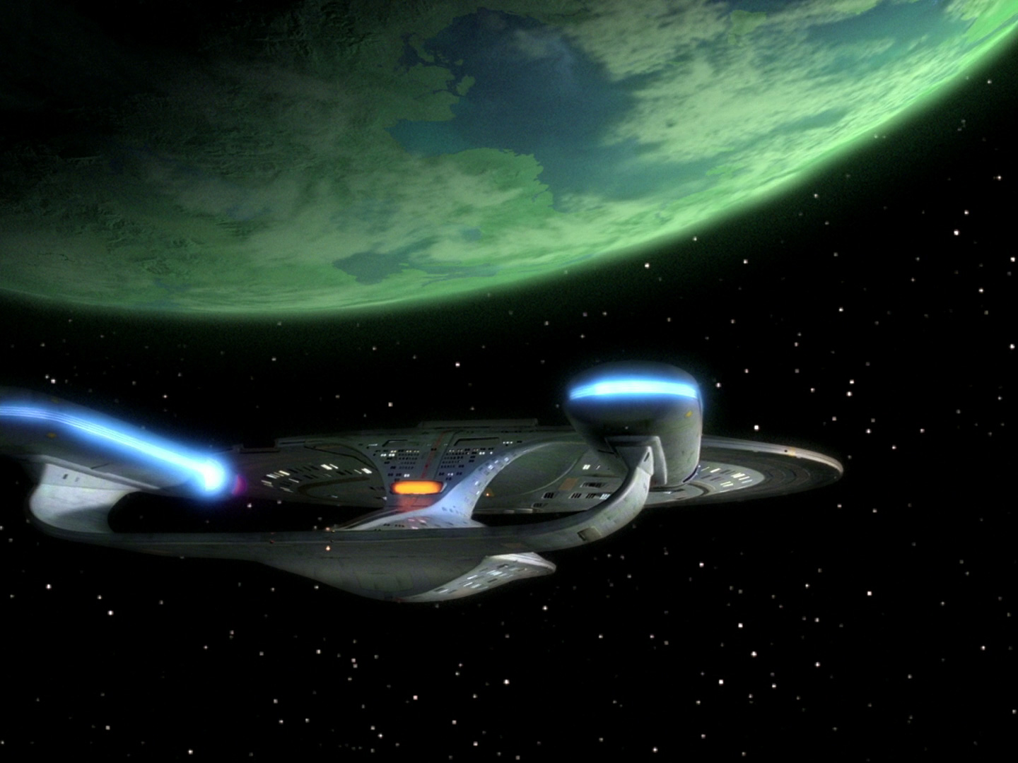 - Max Gabls Planeten werden ebenfalls gelobt, besonders gelungen sollen Tagra IV aus "Eine echte Q", der Gasriese aus "Eine Handvoll Datas" und die Planetenkollision in "Das Schiff in der Flasche" aussehen sowie das von Feuerstürmen geplagte Bersallis III und die Transformation von Indri VIII zu einem leblosen Planeten in "Das fehlende Fragment".