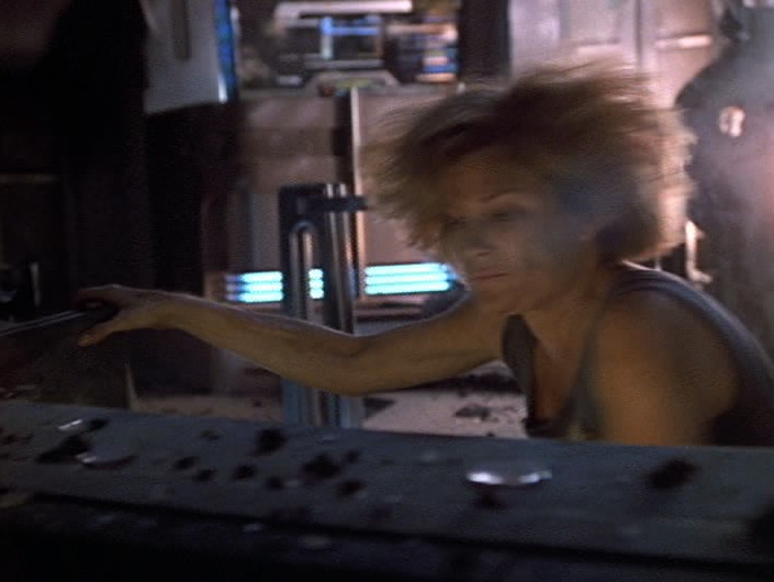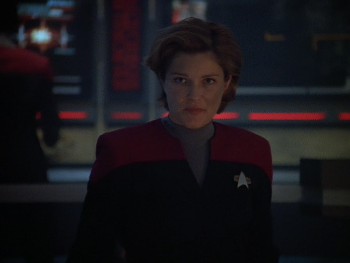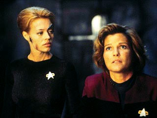 Was Janeways Haare angeht finde ich eine Szene besonders drollig. Ich bin mir nicht ganz sicher, aber ich glaube, es ist in der Doppelfolge "Ein Jahr Hölle". Jedenfalls geht sie da in einen brennenden Raum um irgendwas zu reparieren. Dabei zieht sie sich schwere Verbrennungen auch im Gesicht zu, allerdings wird nicht ein einziges Haar angesengt. Da drängt sich doch der Verdacht auf, dass es sich vielleicht um eine Perücke aus Duraniumfasern oder so handelt.