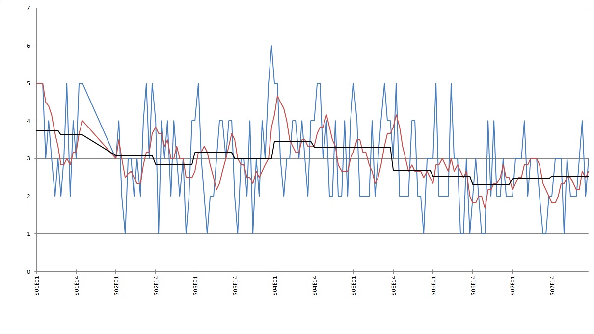 Damit setzt die sechste Staffel mal wieder einen neuen Negativrekord bei VOY. Im Schnitt geht es seit Anfang der fünften Staffel konsequent bergab. Insgesamt bewegt die Serie sich in der Tat auf Engels-Andromeda-Niveau. Was bei Engels-AND die schwachsinnigen Ballerorgien sind, ist bei VOY die ewige Belanglosigkeit der Abenteuer. Das meiste von dem, was die VOY so erlebt, fesselt mich einfach in keinster Weise. Irgendwie hat man alles schon gefühlte drölfzig mal gesehen und die totale Nichtexistenz auch nur eines Mindestmaßes an Charakterentwicklung macht es natürlich nicht besser. Mal sehen, wie die letzte Staffel abschneidet.