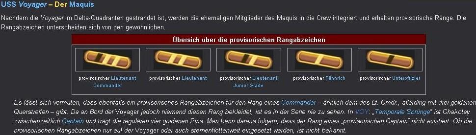 ). Interessant ist aber der Hinweis, dass man nicht weiß, ob es diese provisorischen Rangabzeichen sternenflottenweit oder eben nur auf der "Voyager" gab. Das deckt sich mit dem, was ich mal irgendwann gelesen zu haben glaube. Aber "nichts Genaues weiß ich nicht mehr" ...
