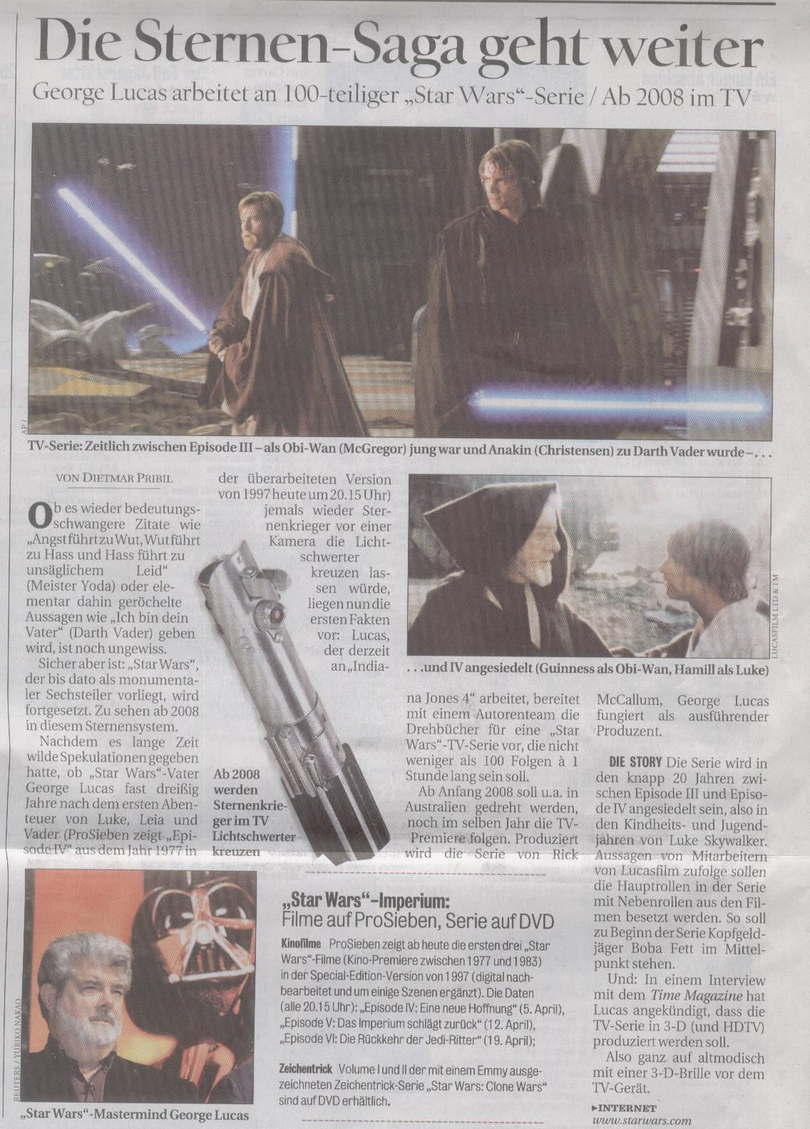 Bereits letzten August kündigte George Lucas eine Star-Wars-Fernsehserie an. Jetzt bestätigte der Produzent der Serie Rick McCullum gegenüber dem Daily Mirror, dass die Arbeiten dafür anlaufen: "Wir sind sehr aufgeregt. Wir haben gerade die Bestätigung erhalten, dass George Lucas selber die Serie schreiben wird". Laut aktuellen Planungen soll innerhalb von 100 Episoden die Geschichte zwischen Episode 3 und dem originalen Star-Wars-Film von 1977 erzählt werden. Außer Anthony Daniels, der C3P0 darstellt, wird kein Schauspieler aus den Kinofilmen in der Serie auftauchen.