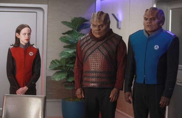 Bortus wird derweil von seinem Partner erstochen. Ein offenbar ganz normales Vorgehen unter Moclanern, wenn diese sich scheiden wollen. Was zu entsprechenden Diskussionen darüber führt, welche Alien-Verhaltensregeln auf einen Unionsschiff moralisch vertretbar sind.