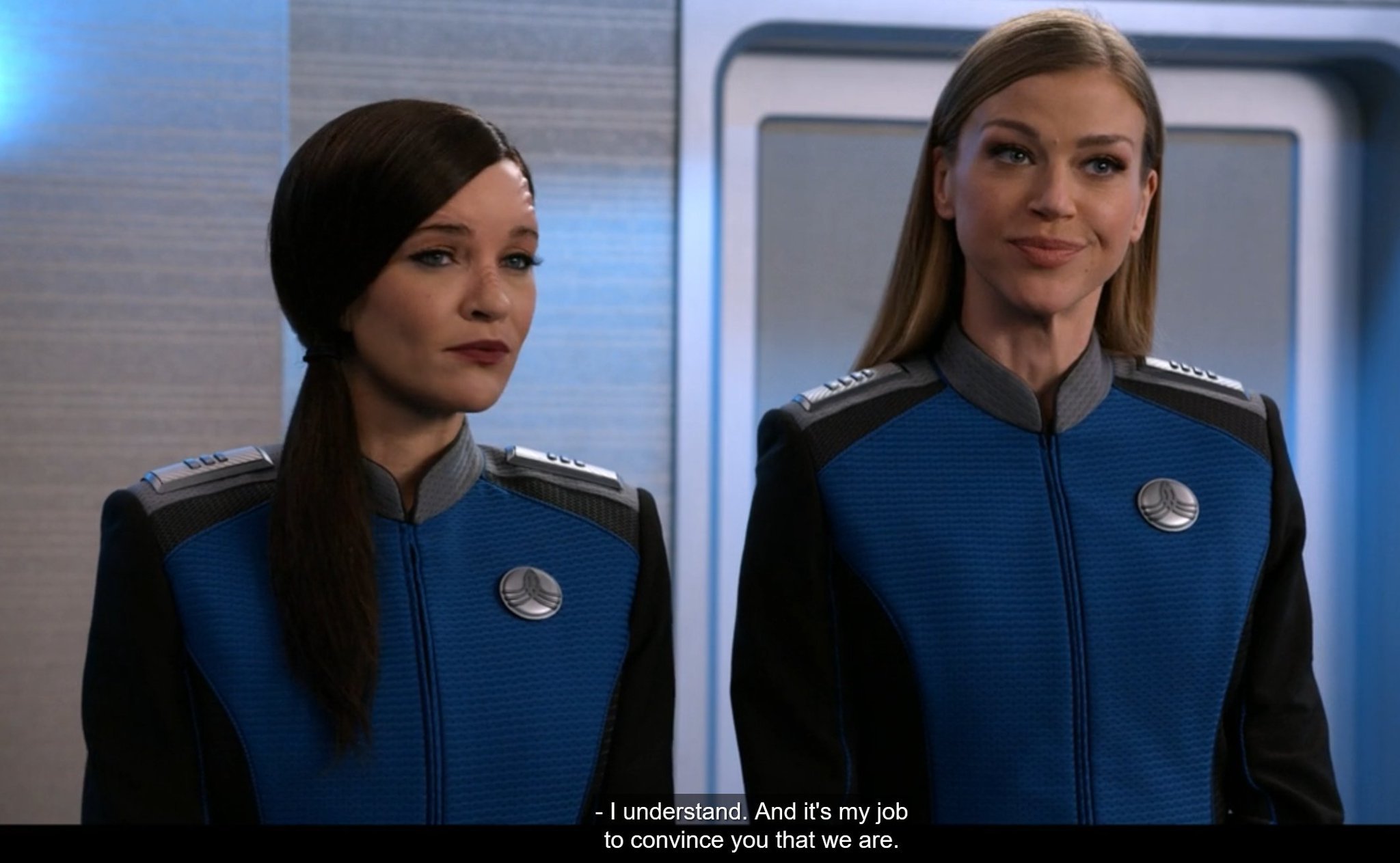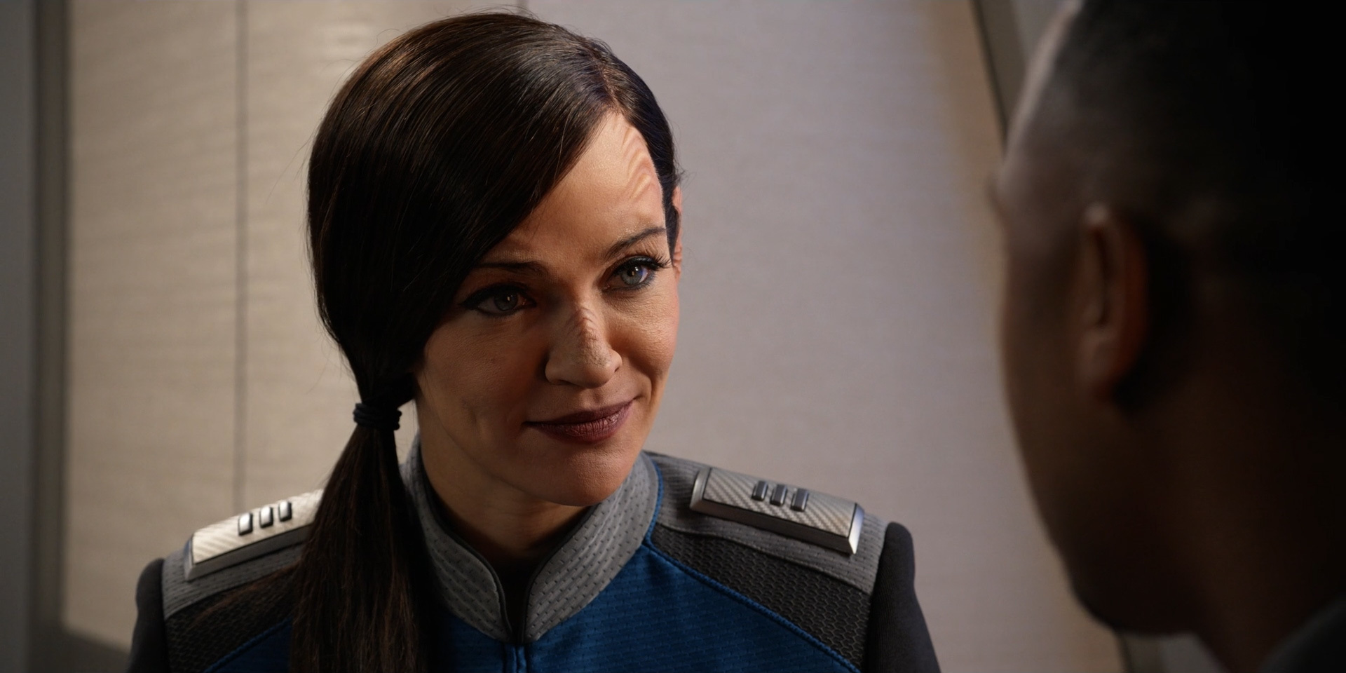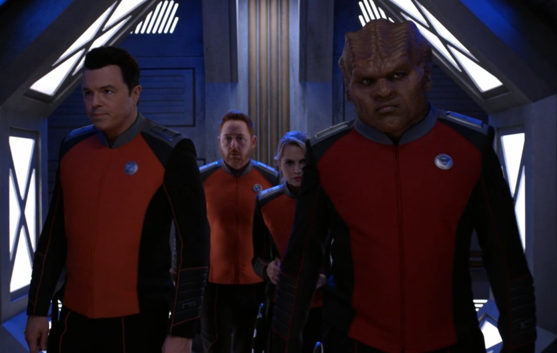 Bei den Bildern zu dieser Folge fällt auf, dass alle bekannten männlichen Crewmitglieder der Orville den Rang eines Ensigns im Bereich Technik oder Sicherheit bekleiden. Die Frauen jedoch sind hochrangig, und Talla ist sogar im Bereich Kommando tätig. Ich vermute, dass die Orville auf eine matriarchistische Alien Spezies trifft.