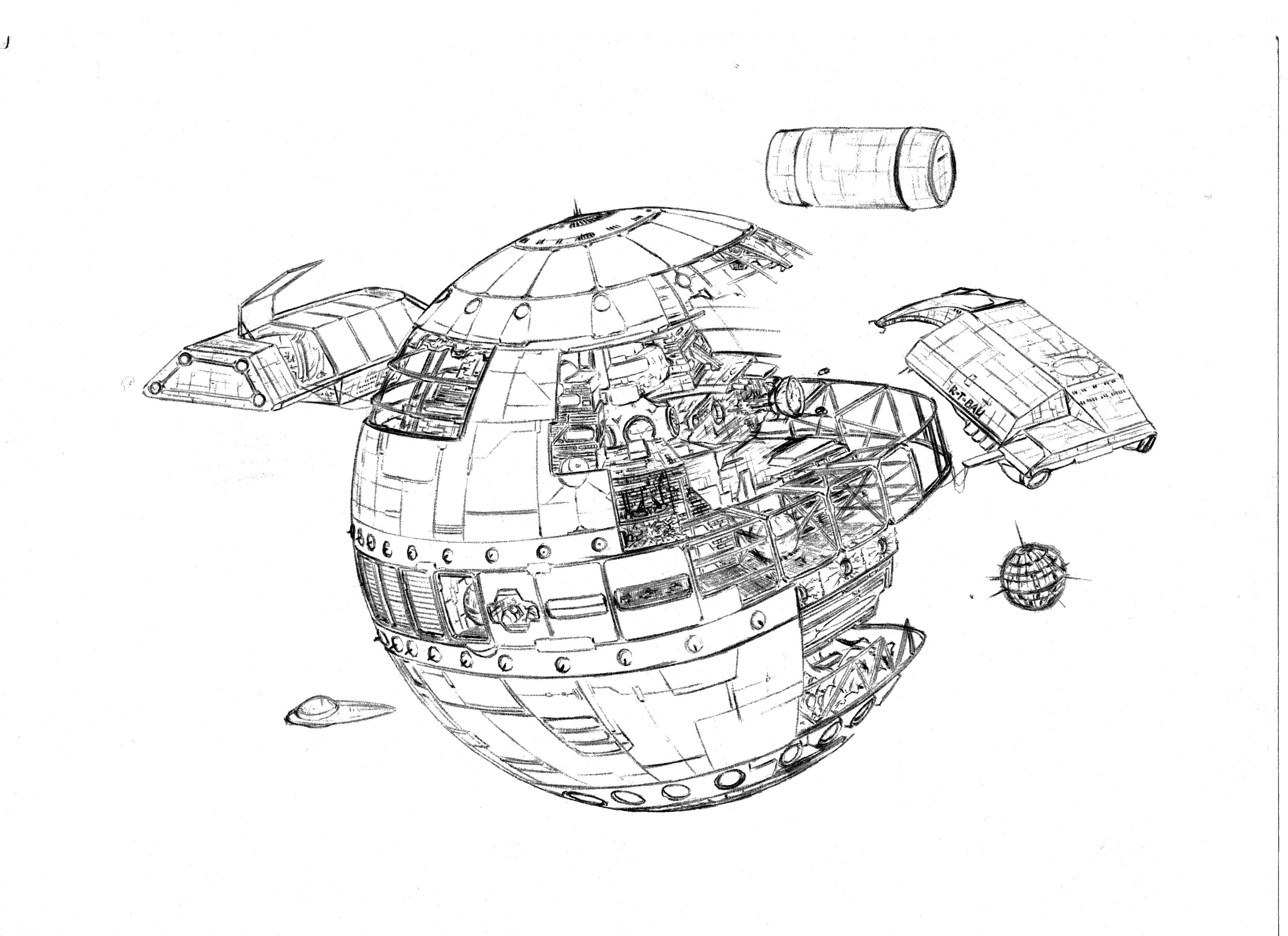 so ich hab jetzt mein kugelraumer aus den perry rhodan universum fertig...naja fertig würd ich nicht sagen, da er sich noch im bau befindet auf der zeichnung. ein kugelraumer zu zeichnen ist ja jetzt nicht soooo aufregend, deswegen wollte ich mit einer darstellung eines halbfertigen kugelraumers etwas mehr ins deteil gehen.